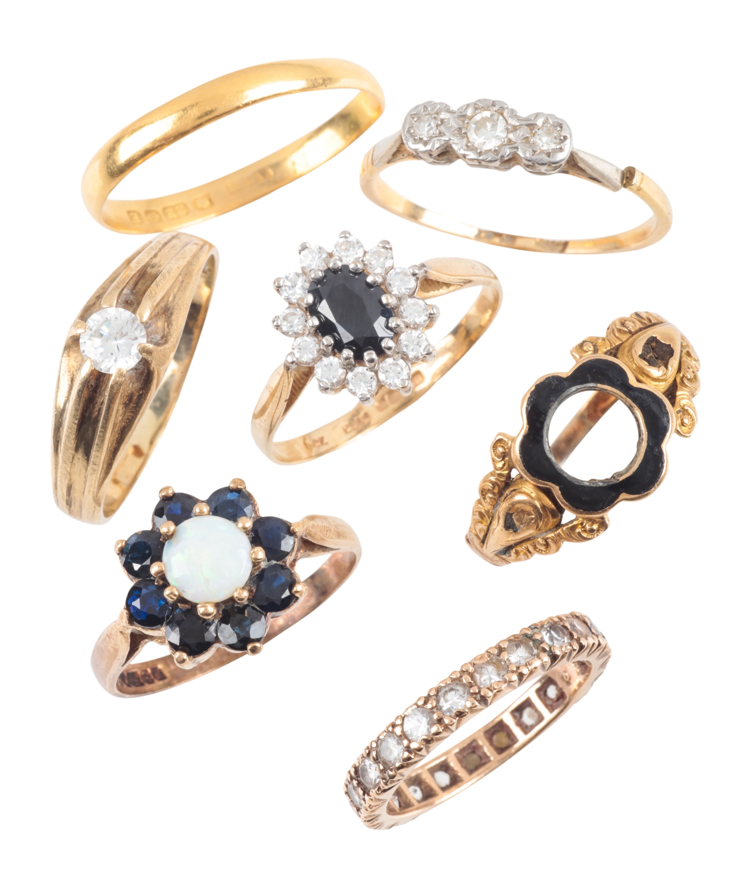 to include a 22ct gold wedding band, c. 2.3 grams, an 18ct gold three stone diamond ring, c. 2.0 grams, four 9ct gold dress rings, c. 10 grams, and a"15ct" gold memorial ring, c. 2.7 grams (7)