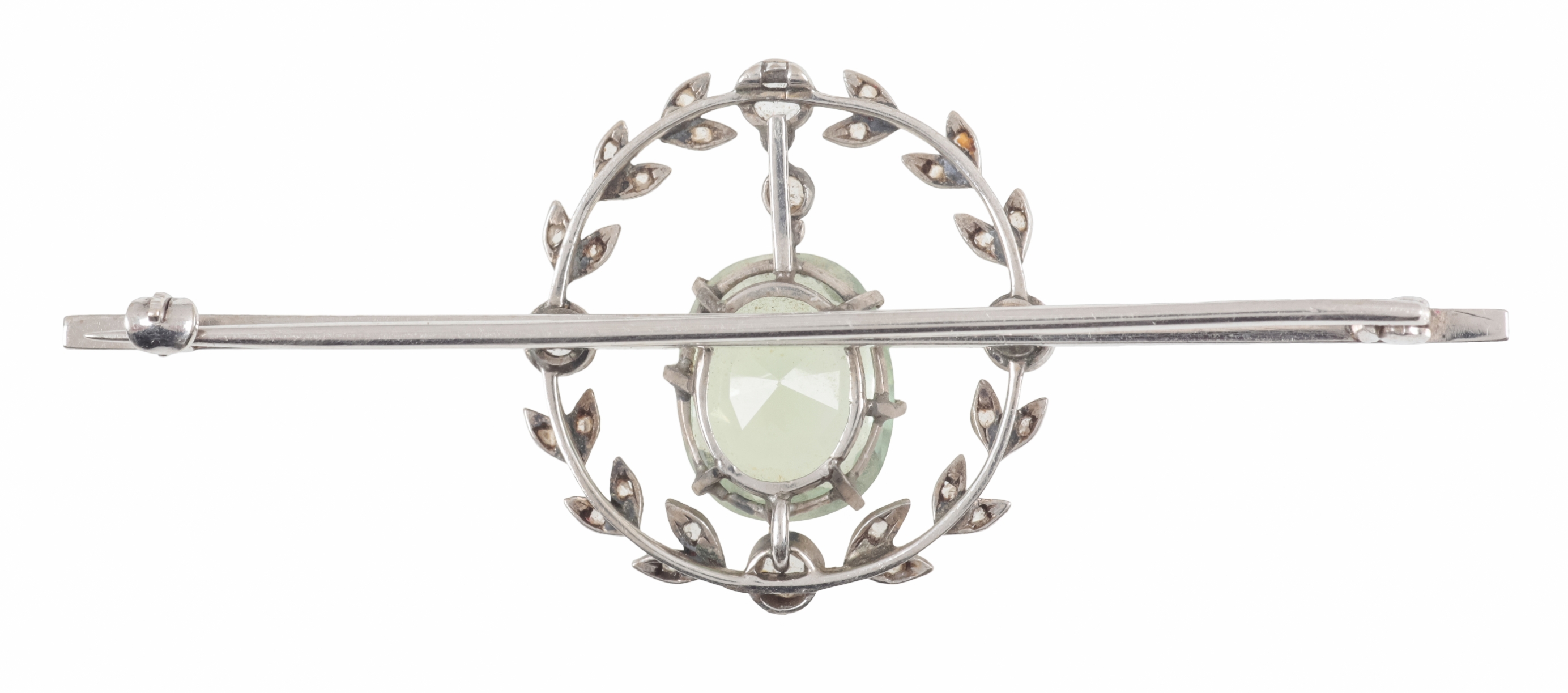 the pale green oval mixed cut aquamarine c. 11mm x 9.2mm, surrounded by a diamond set foliate band quarted by rose cut diamonds, unmarked, surface testing as 14ct, in fitted box
