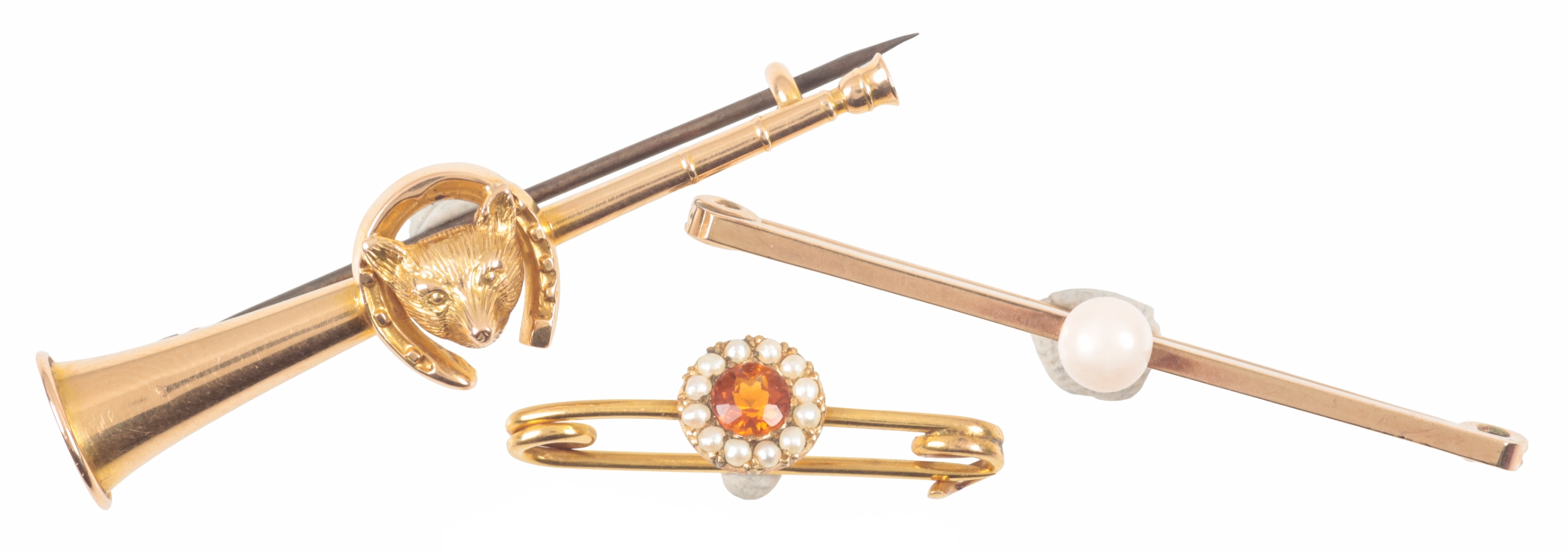 in the form of a hunting horn with mounted horse shoe and fox mask, c. 45mm long, hallmarked with base metal pin in fitted box; together with two other bar brooches, both surface testing as 9ct, c. 5.8 grams gross weight (3)