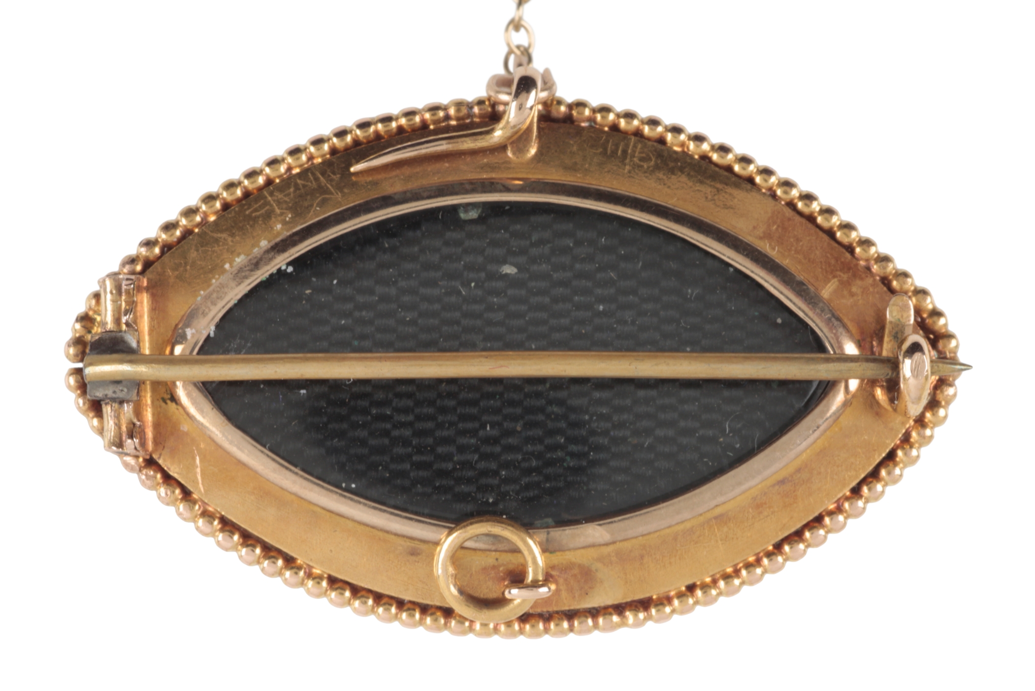 the banded agate set with seed pearls, within an enamel and unmarked gold border, the reverse with woven hair, suspension loop and safety chain, c.43mm wide, c. 13.7 grams total weight