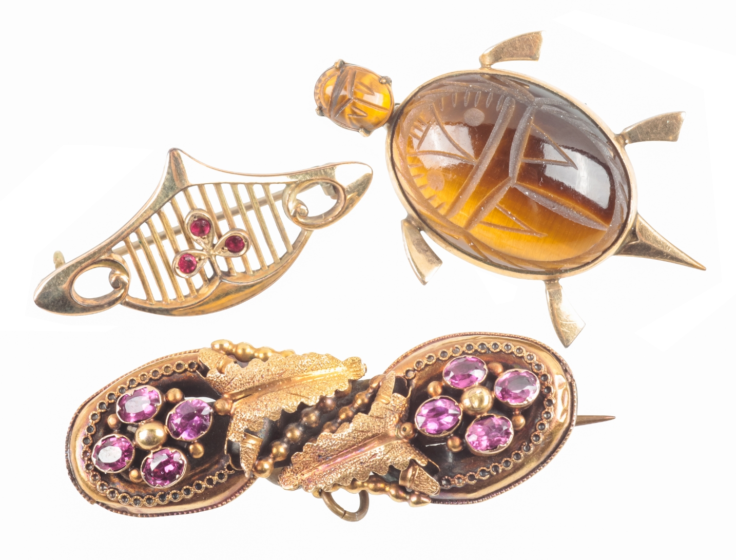 to include a tigers eye turtle brooch, c. 40mm long, a Victorian gem-set brooch pendant, c. 48mm wide, and one other gem-set brooch, 38mm wide, all in unmarked yellow metal (3)
