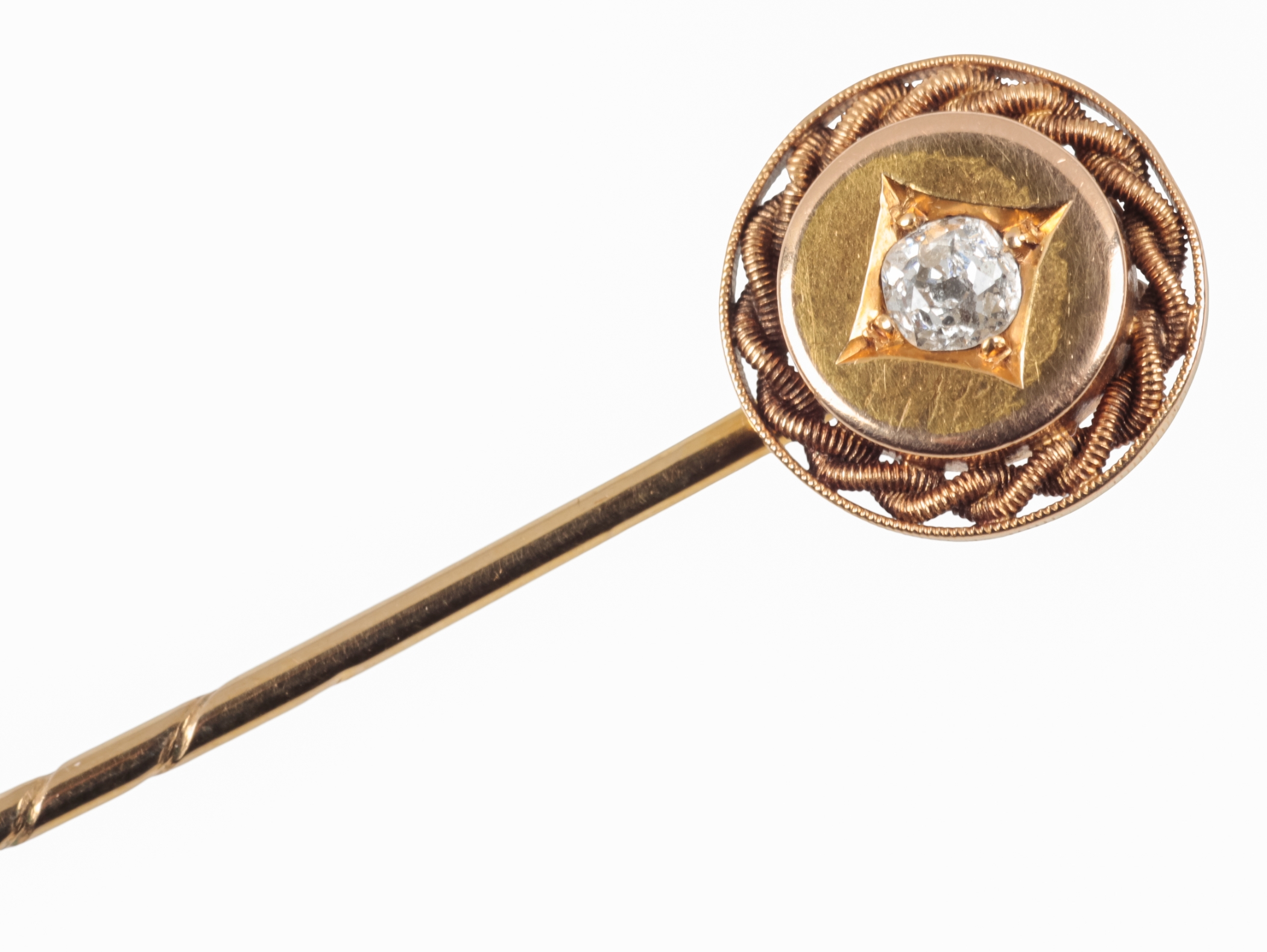 the old cut diamond c. 0.10 carats set in a roundel with twisted rope border, unmarked, the head surface testing as 14ct and the later pin testing as 9ct, c. 1.9 grams