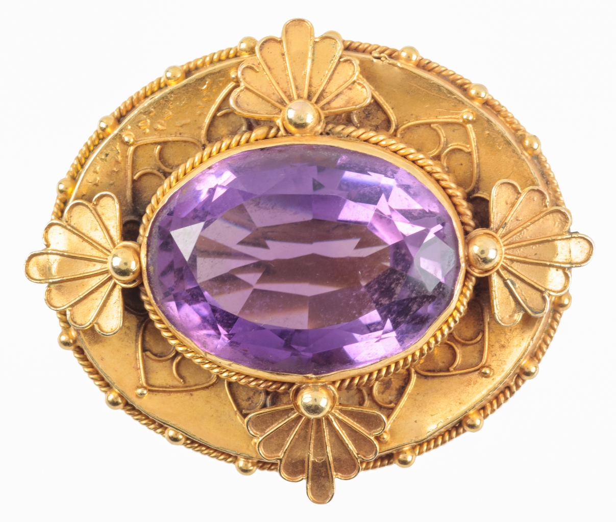 the oval mixed cut amethyst c. 22mm x 16mm, set in an Etruscan revival mount surface testing as 18ct, overall c. 42mm x 35mm, c. 13.5 grams gross weight