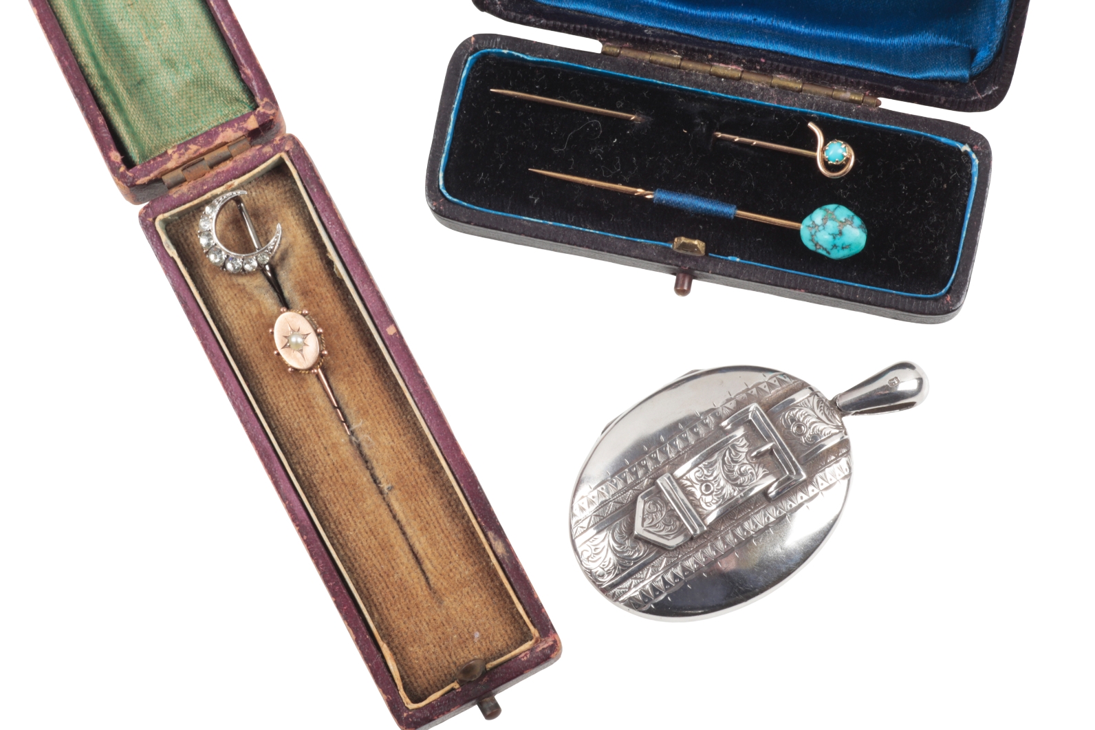 the nugget with quartz crystal inclusions held in six claw mount, unmarked, surface testing as 9ct, in fitted box; together with a seed pearl stick pin, stamped 9ct; a paste set half moon stick pin, stamped 925, boxed; two turquoise mounted stick pins, surface testing as 9ct ; and a silver locket with decorative buckle decoration, hallmarked (6)