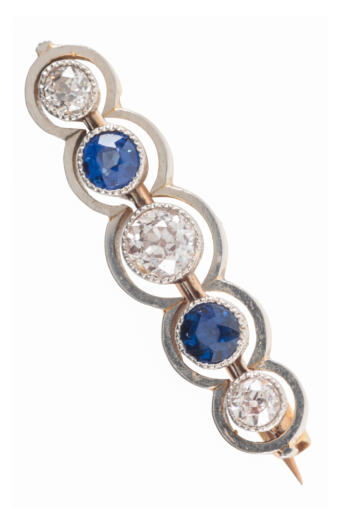 three round-cut diamonds interspersed with two round-cut sapphires, set in unmarked yellow metal, with pin fastener, 2.4cm long, c. 2.6 grams total weight