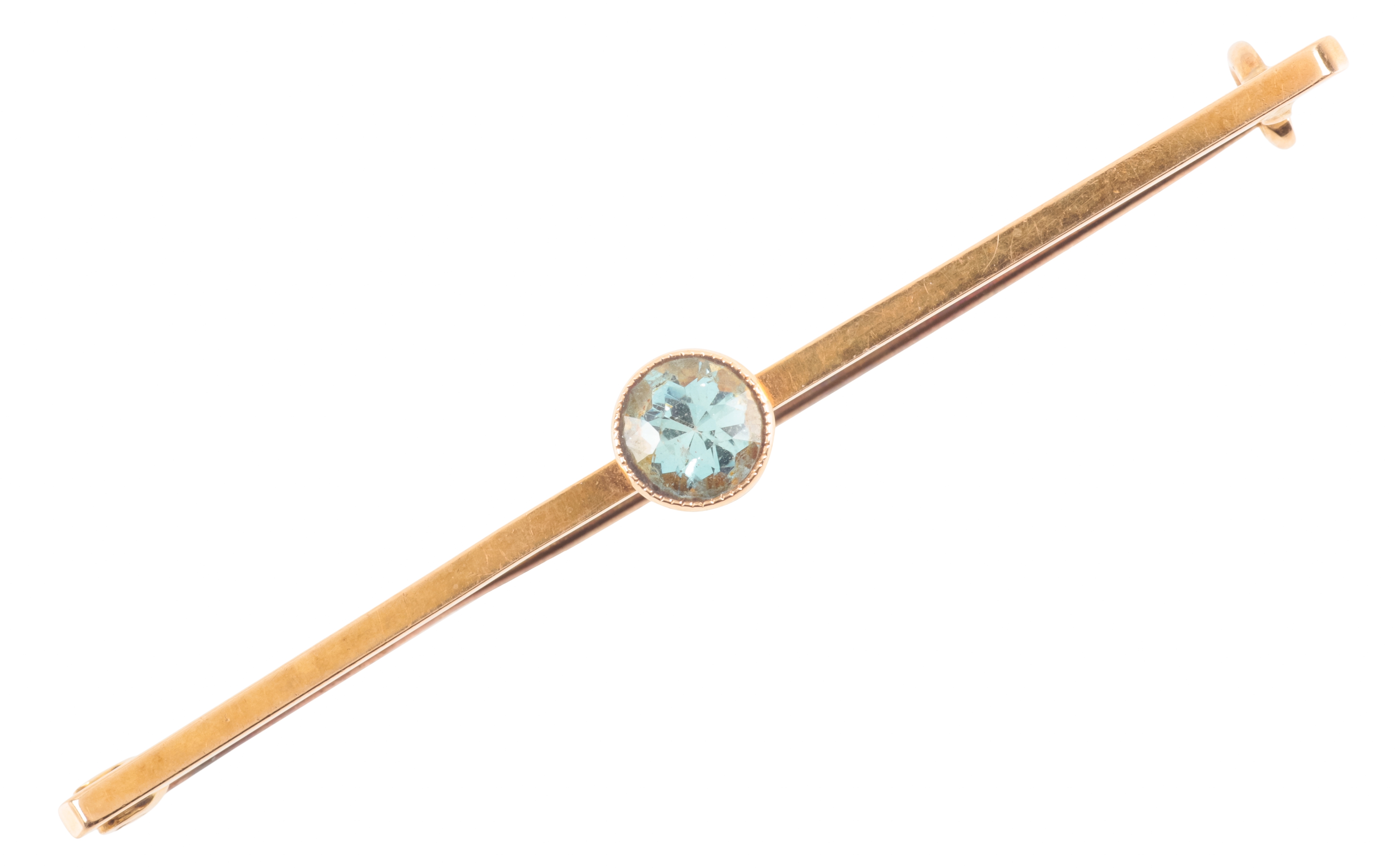 presumed 9ct, the centre set with a pale blue gem stone, c54mm long, c. 3 grams total weight