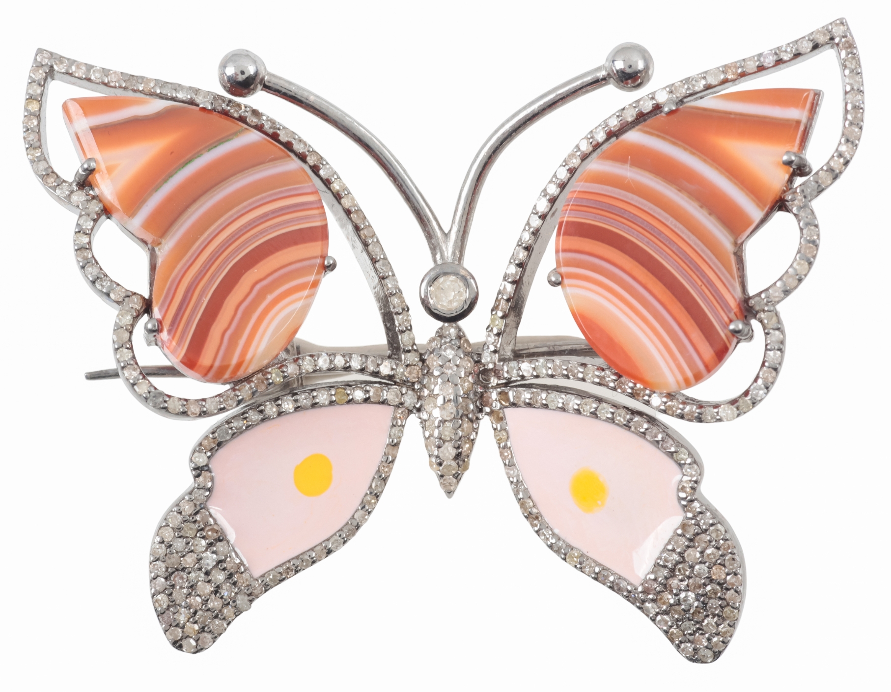 set with banded agate, pink and yellow enamel, pave set diamonds, c. 1.10 carats, combined, unmarked silver, overall c. 37mm x 50mm, c. 11.1 grams, boxed
