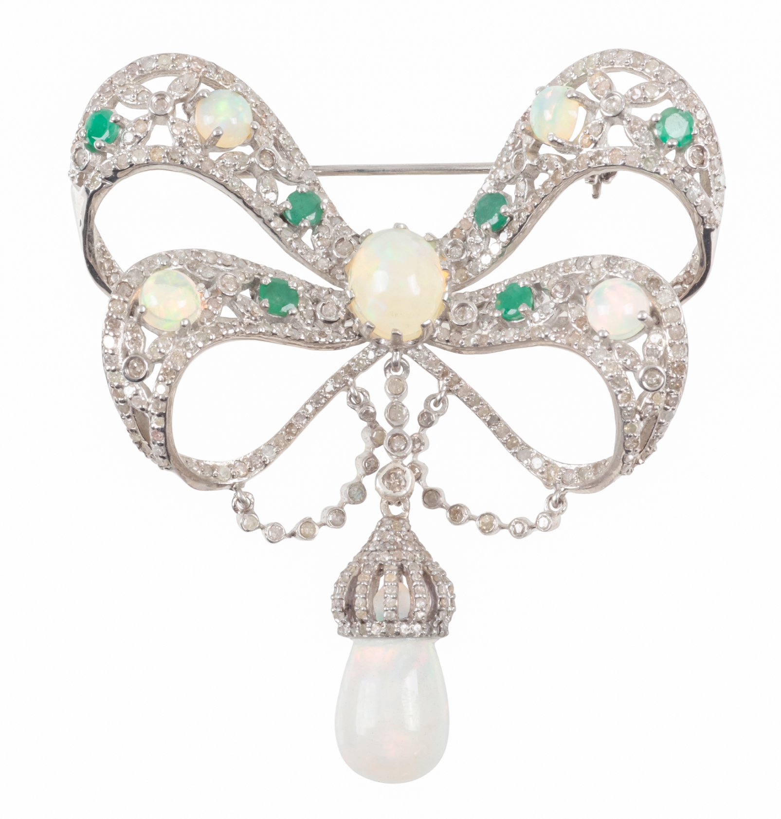 AN OPAL, EMERALD AND DIAMOND SET BOW BROOCH