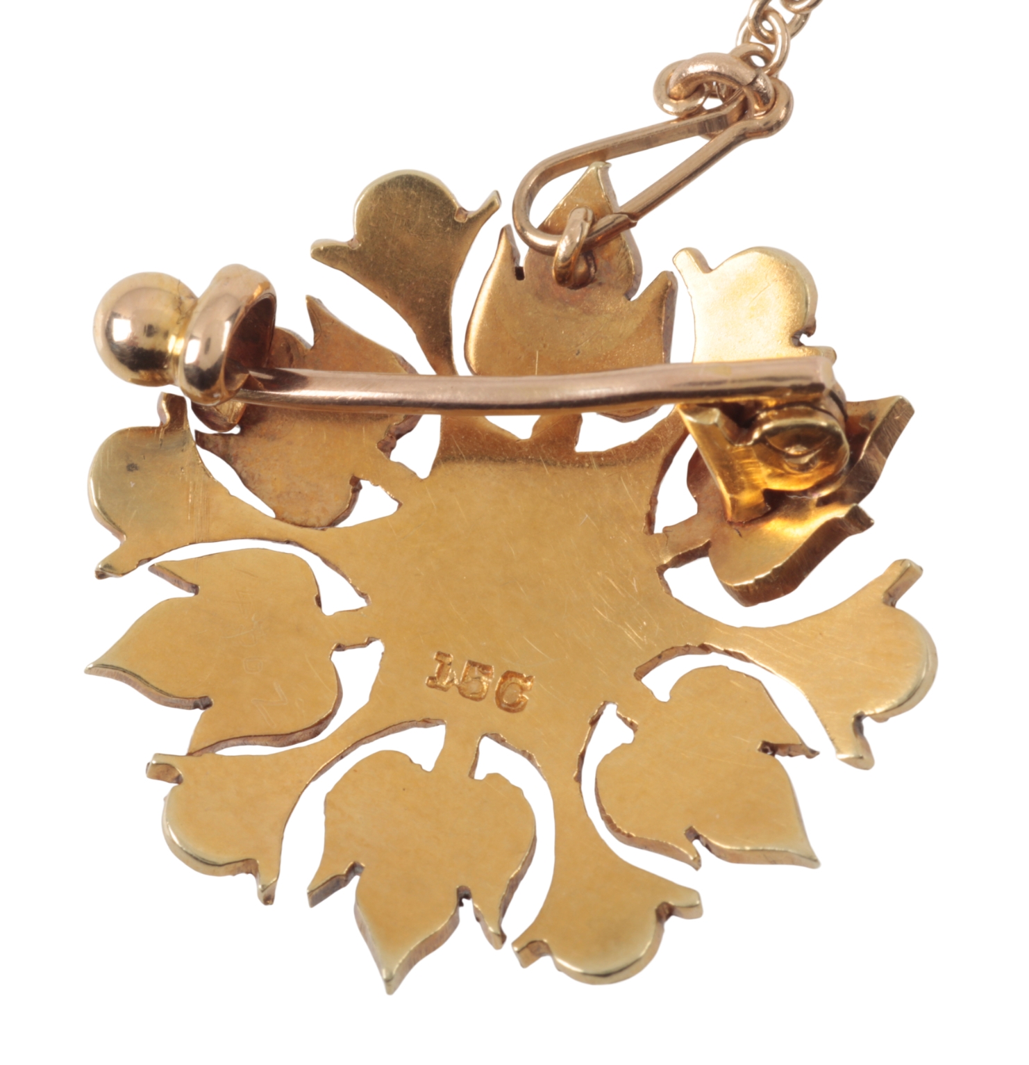 of round form, the centre set with a flowerhead, surrounded by alternating stylised flowerheads and leaves, stamped 15ct, with detachable safety chain, c. 25mm diameter, c. 5.4 grams, (the pearls untested)
