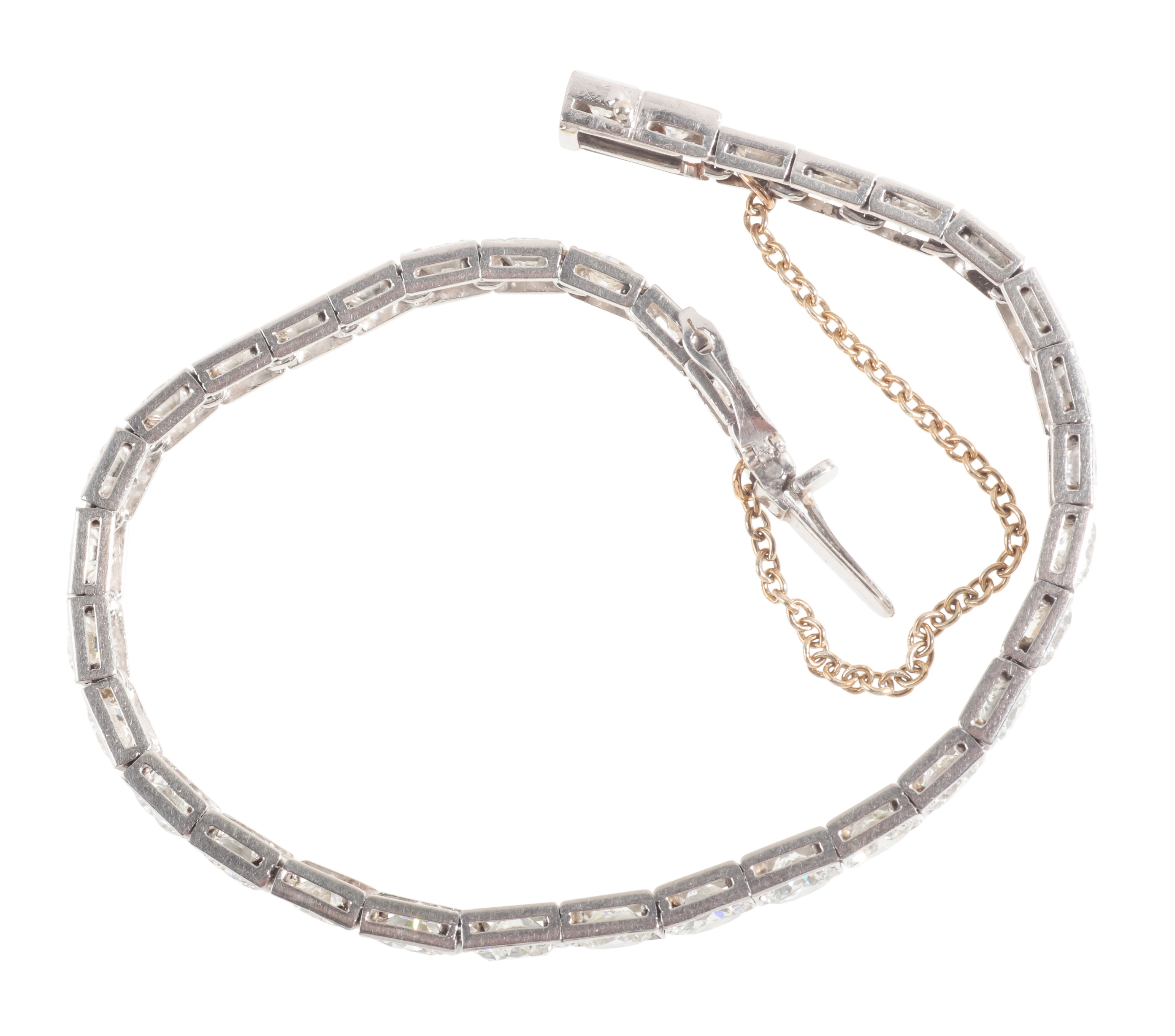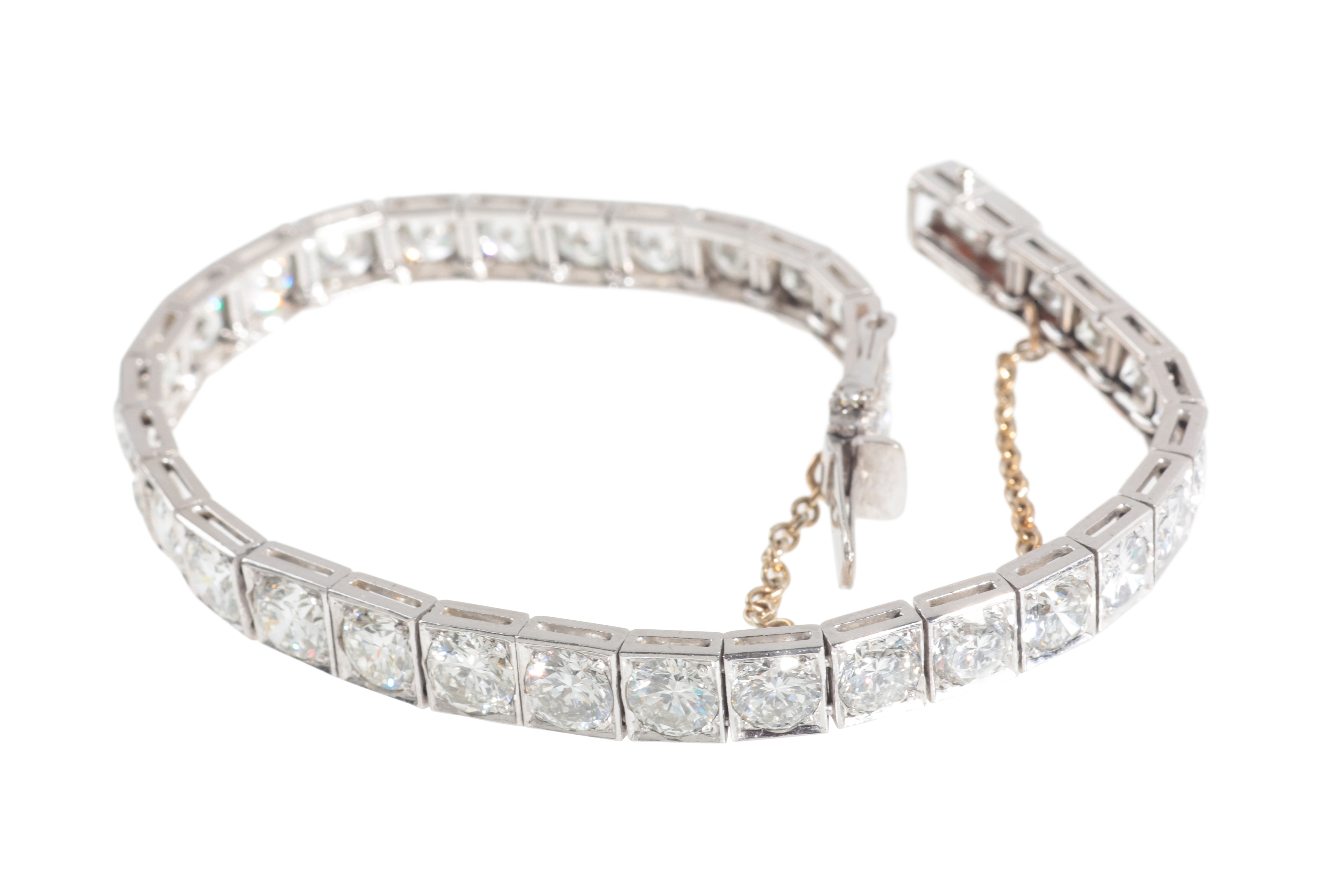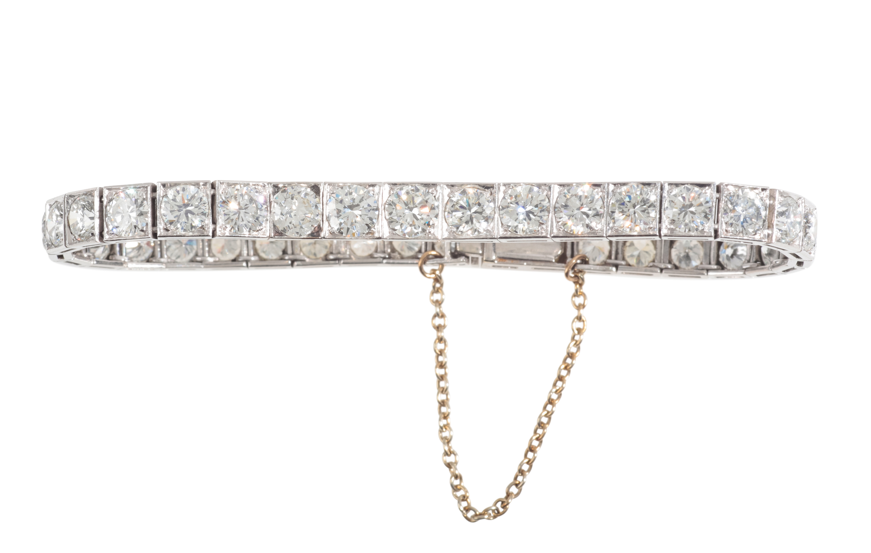 set with thirty-six round brilliant cut diamonds each in hinged square setting, total diamond weight c. 11.2 carats, with concealed tongue and groove clasp with safety clasp and additional safety chain, unmarked testing as Platinum, c. 20.3 grams