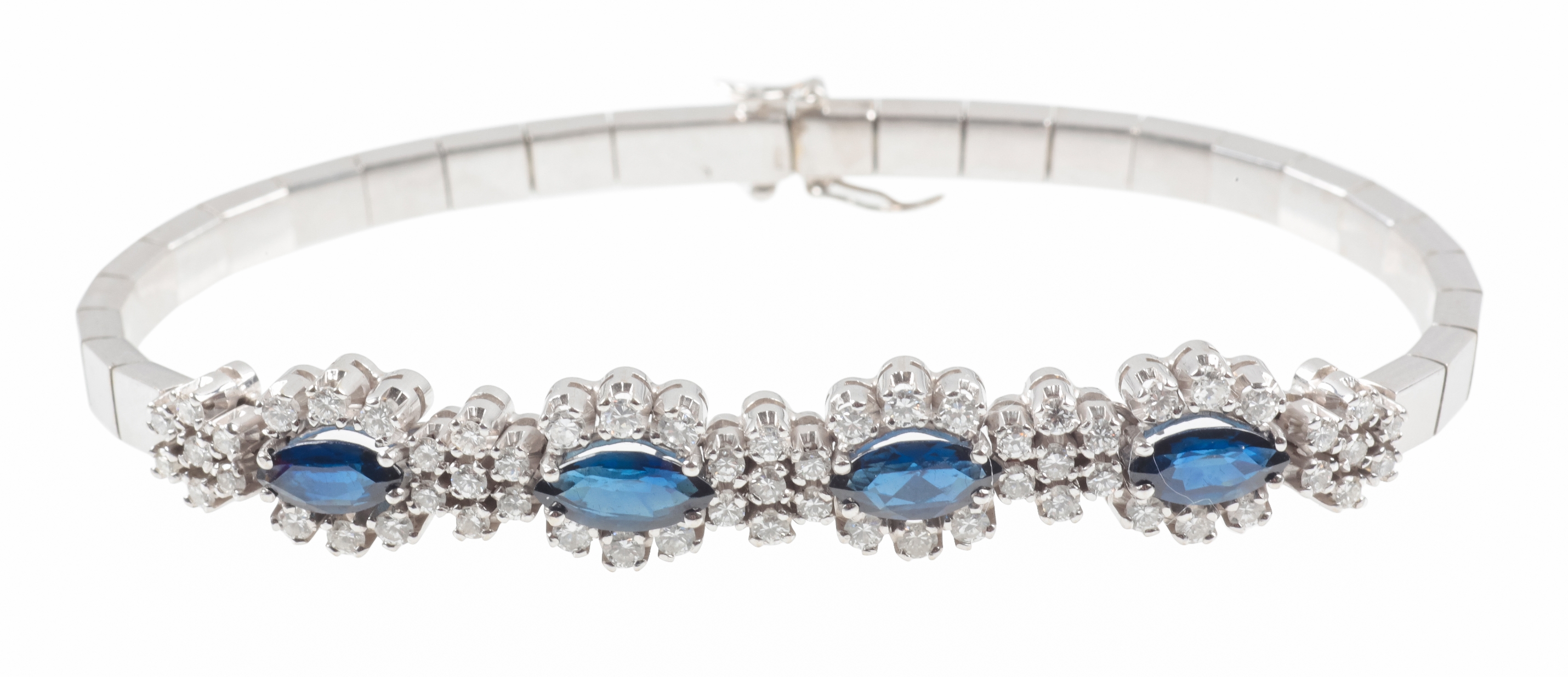 with four marquise cut sapphire and diamond clusters, the tongue and groove clasp with two safety catches, stamped 750, c. 182mm long, c. 21.9 grams