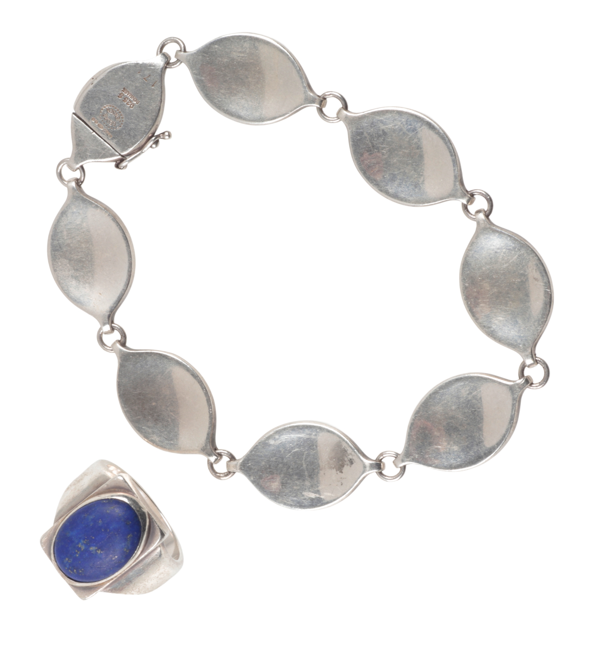 the bracelet with leaf shaped links, silver import marks, pattern no. 171, Georg Jensen marks and 925S Denmark; together with a lapis lazuli cabochon ring, silver import marks, pattern no. 84A, Georg Jensen marks and 925S Denmark, ring size N, c. 52.3 grams gross (2)