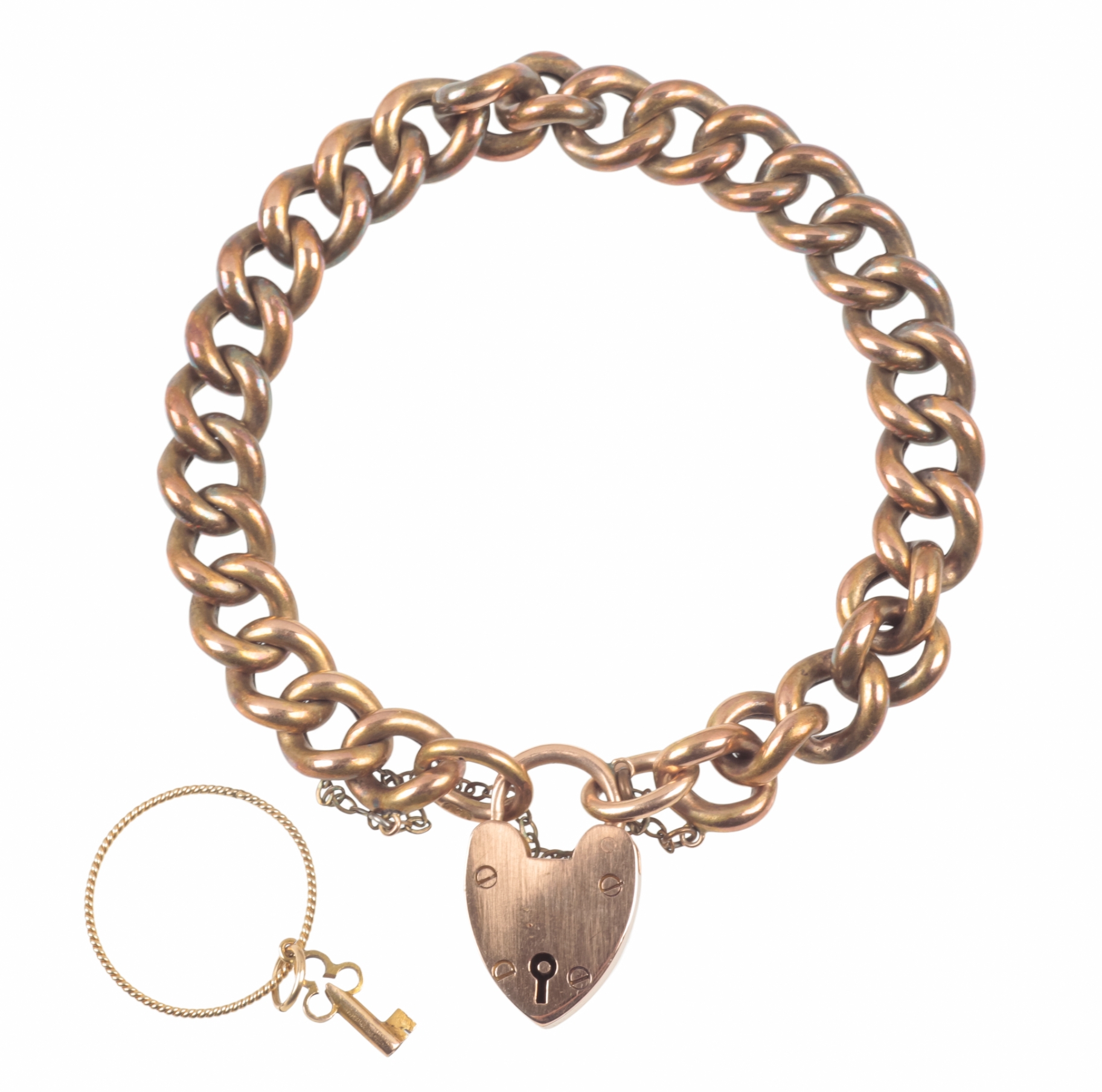 with heart shaped padlock clasp, stamped 15ct, with original padlock key and additional safety chain, c. 25.2 grams