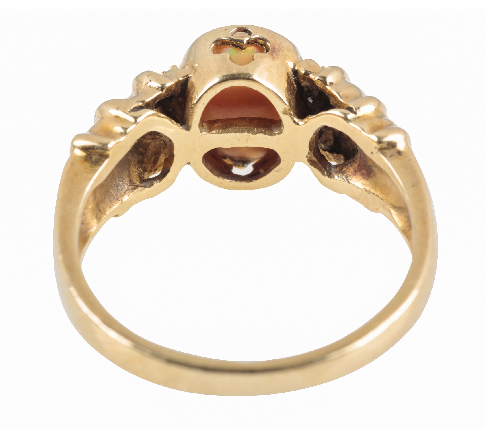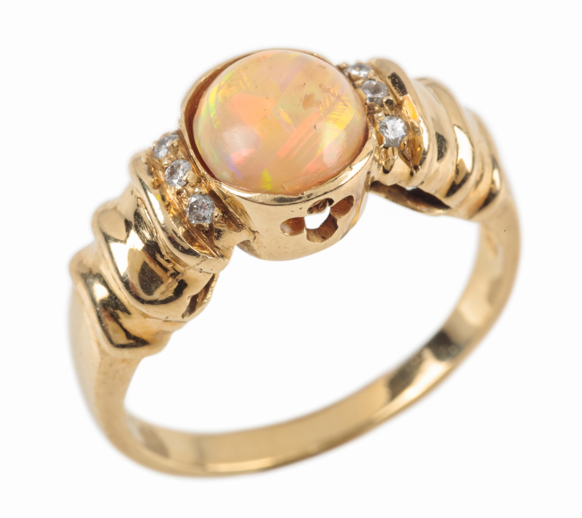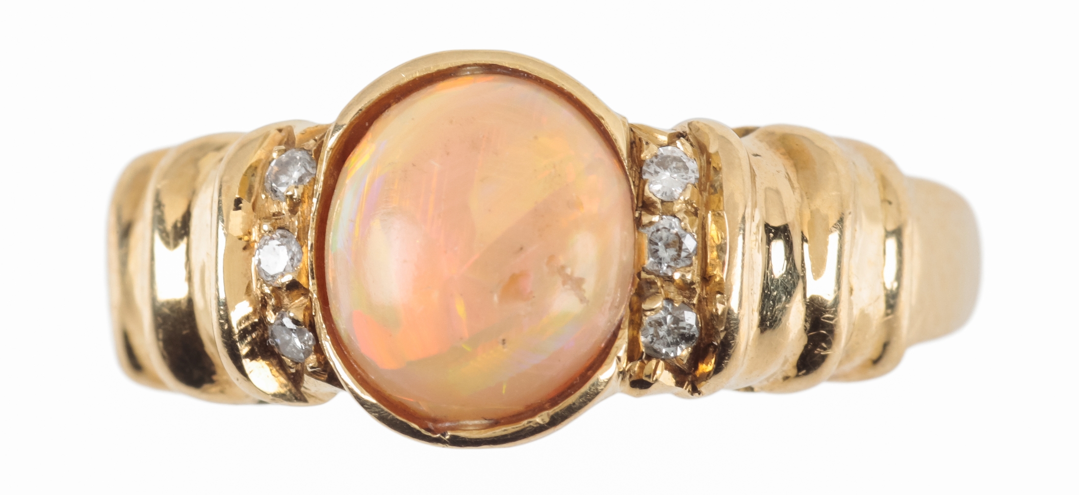 the oval-cut opal with orange hues, flanked either side with three round-cut diamonds, to a 14k gold shank, ring size P