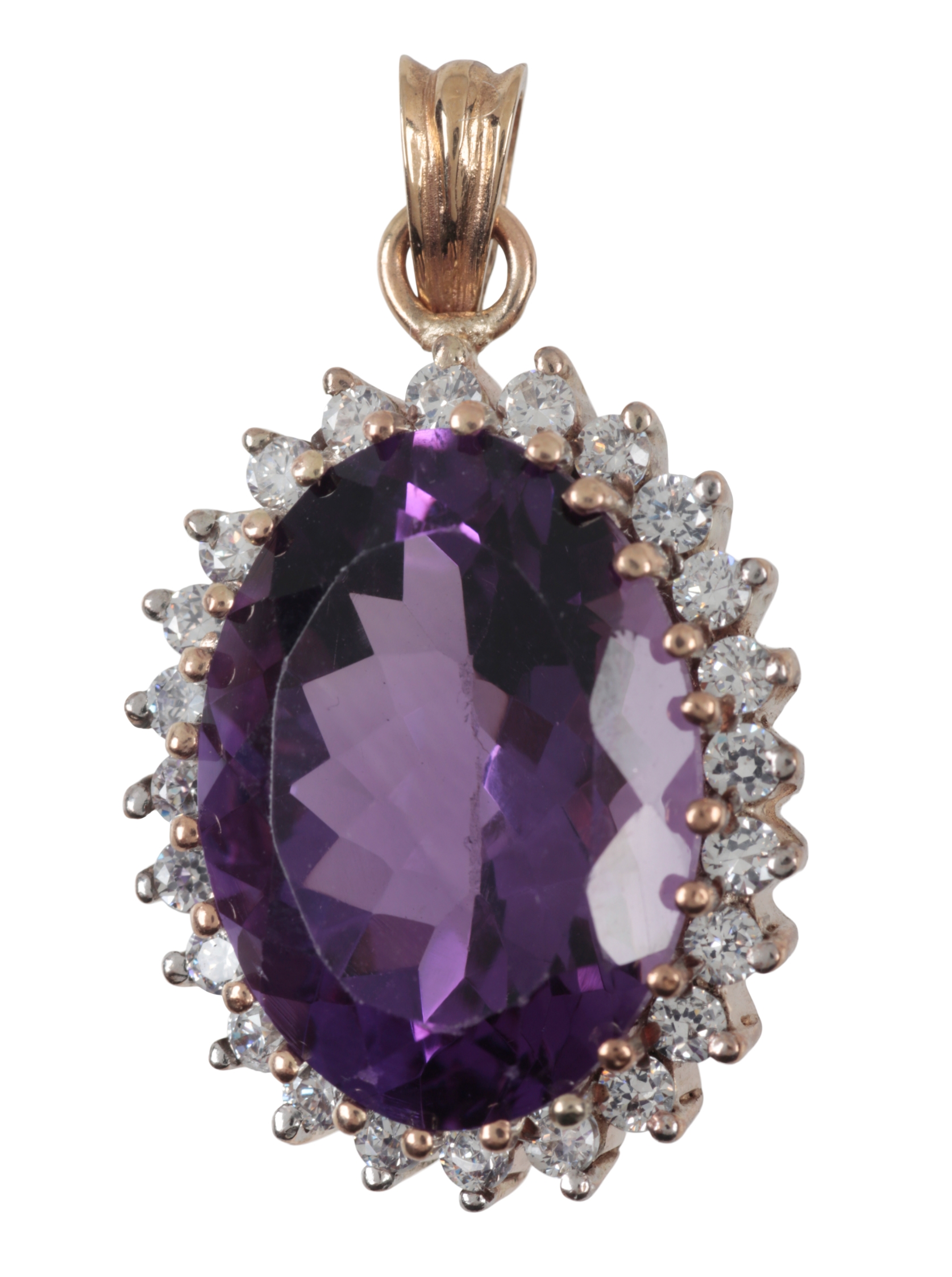 the oval mixed cut amethyst c. 17mm x 11.5mm, surrounded by a round brilliant cut diamond halo, overall drop including bail c. 27mm, set in yellow metal testing surface testing as 9ct, c. 6.5 grams
