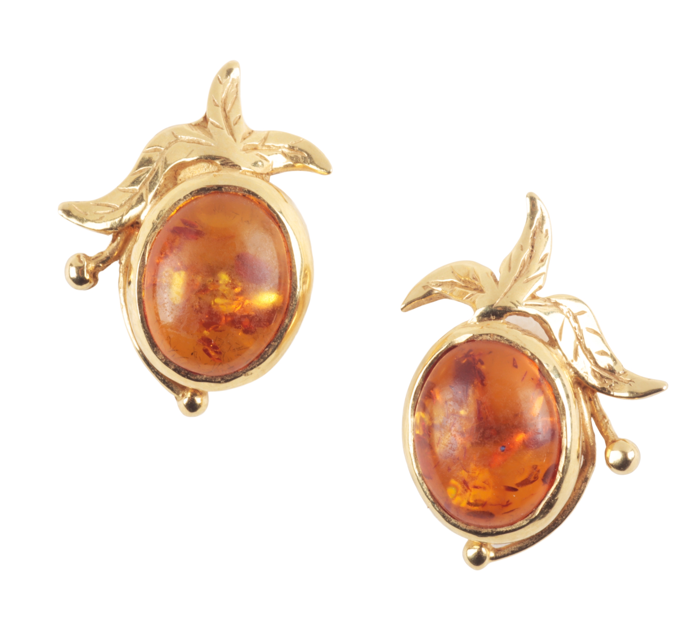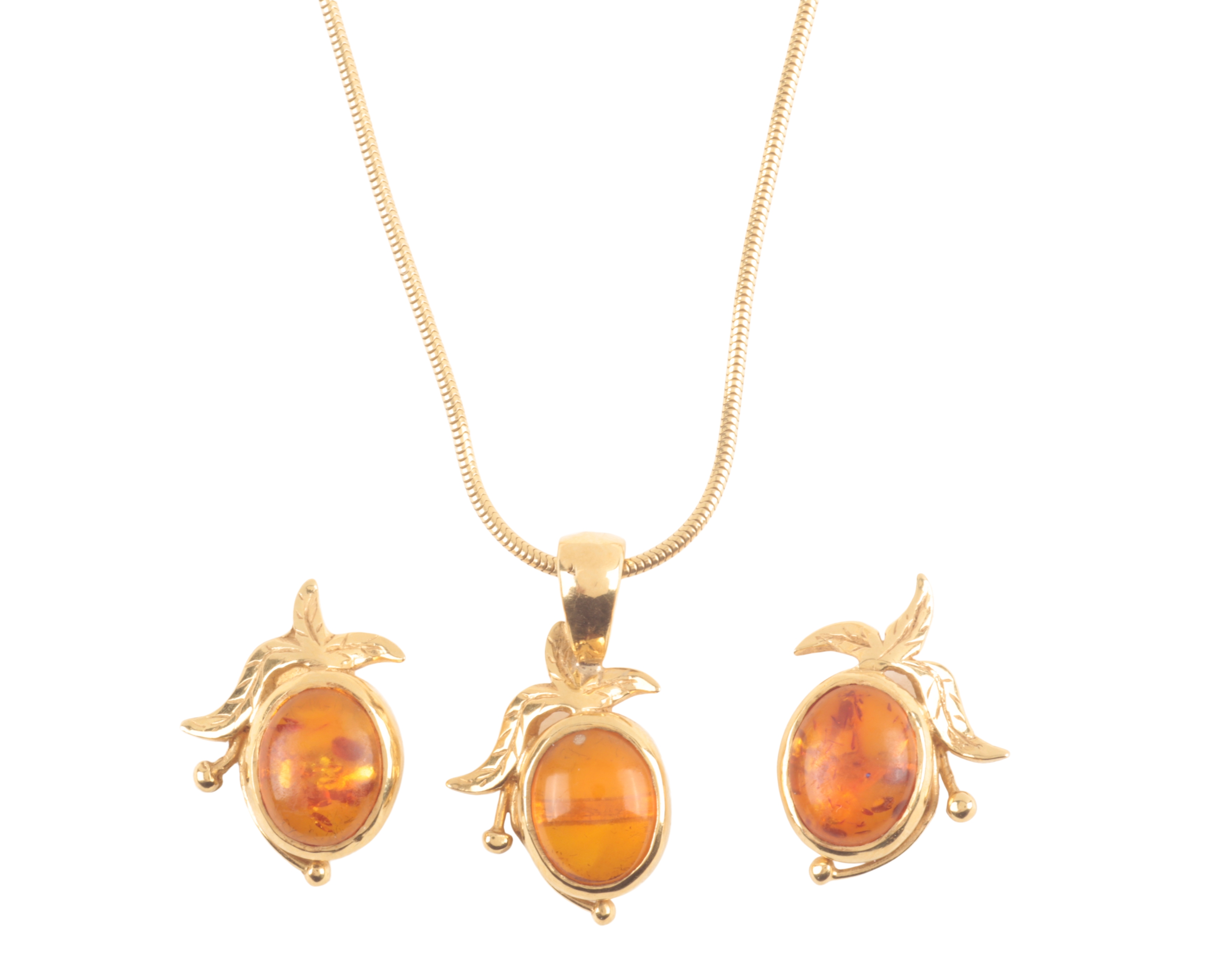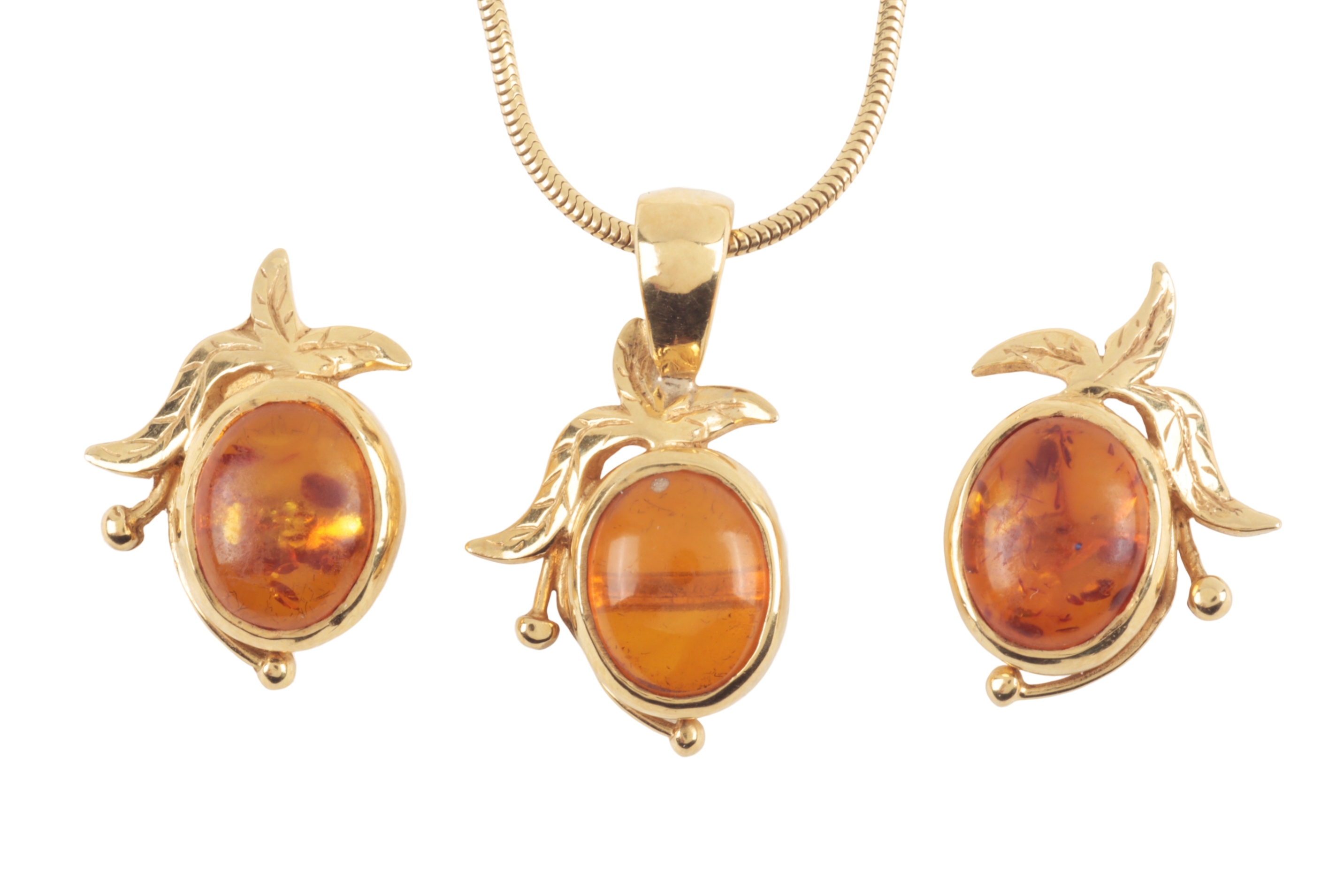AN "AMBER" AND GOLD PENDANT NECKLACE WITH EARRINGS EN SUITE