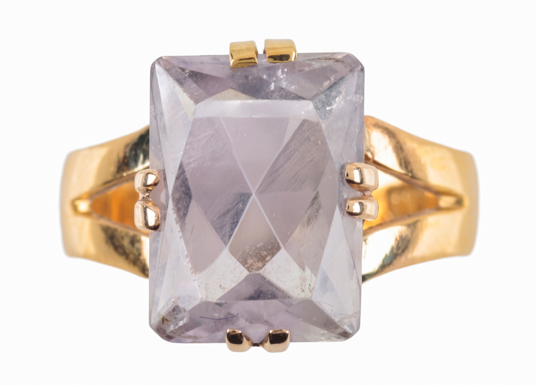 the amethyst claw set to an unmarked yellow metal shank, with openwork shoulders, ring size P, c. 4.5 grams