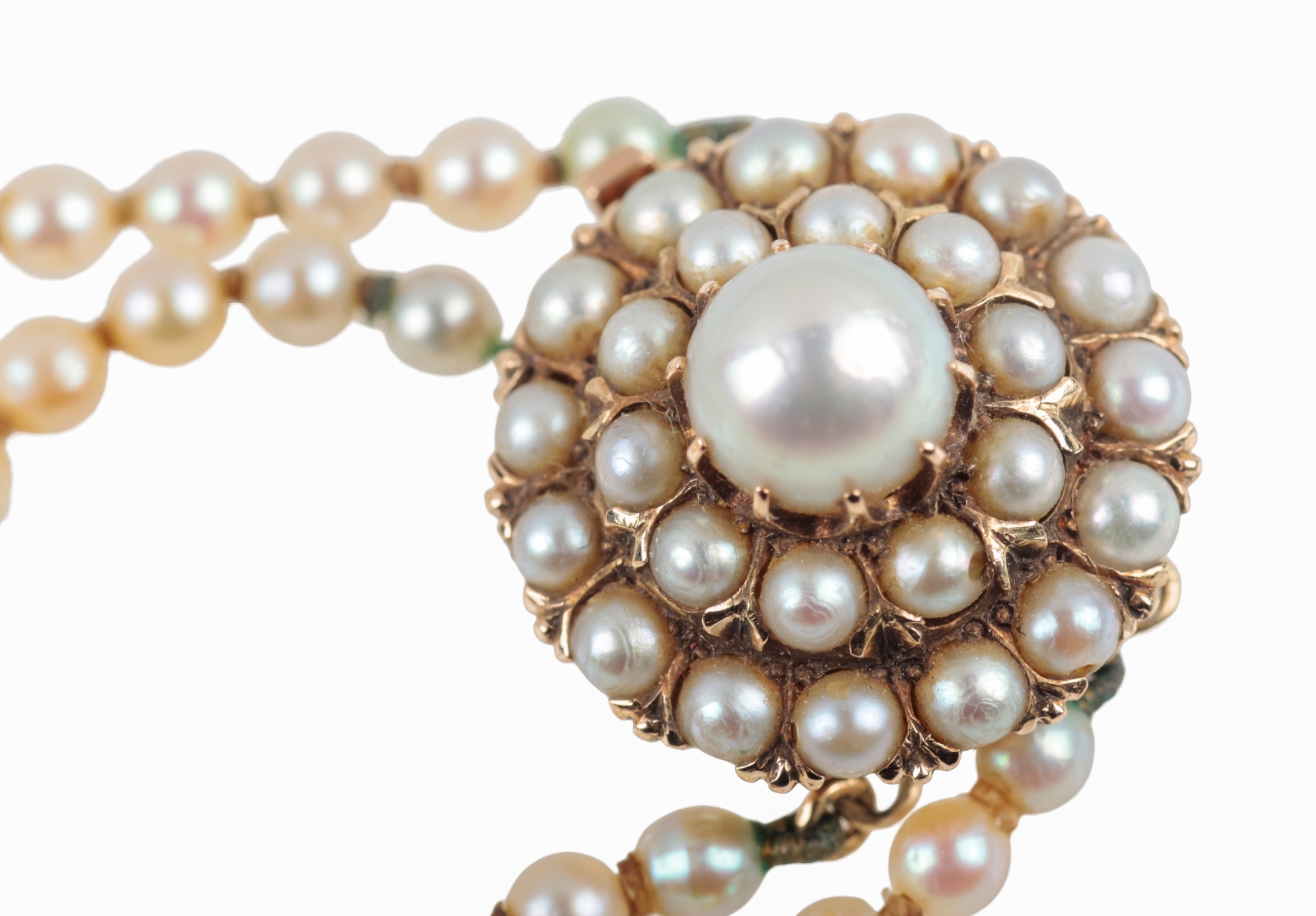 each graduated pearl knotted, terminating onto a 14k gold clasp with raised pearl cluster, the longest strand 48cm long