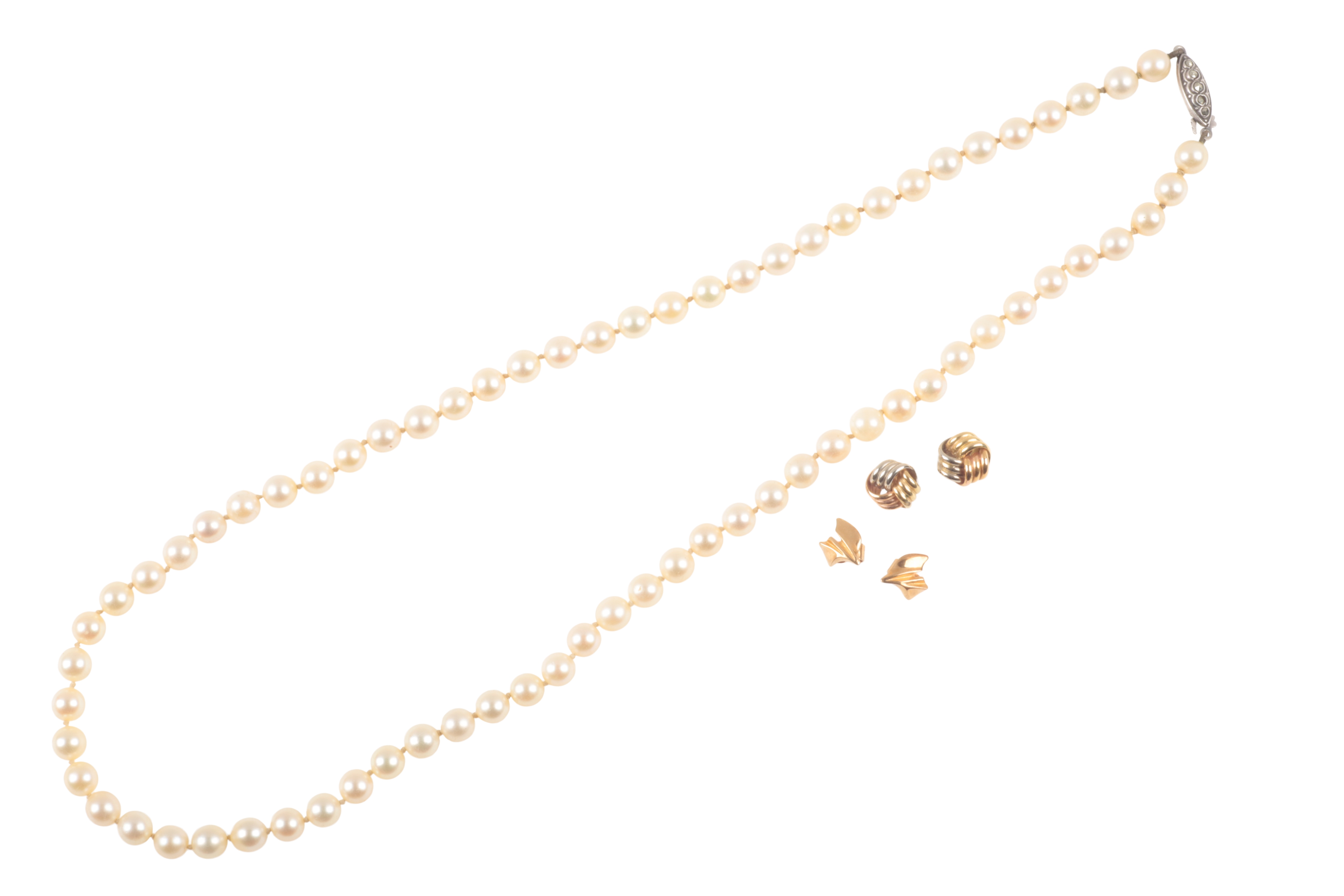 c. 4.41mm, with clasp stamped silver Germany; together with a pair of knot tricoloured ear studs, surface testing as 18ct; and a pair of asymmetrical ear studs, surface testing as 18ct, c. 6.2 grams (3)