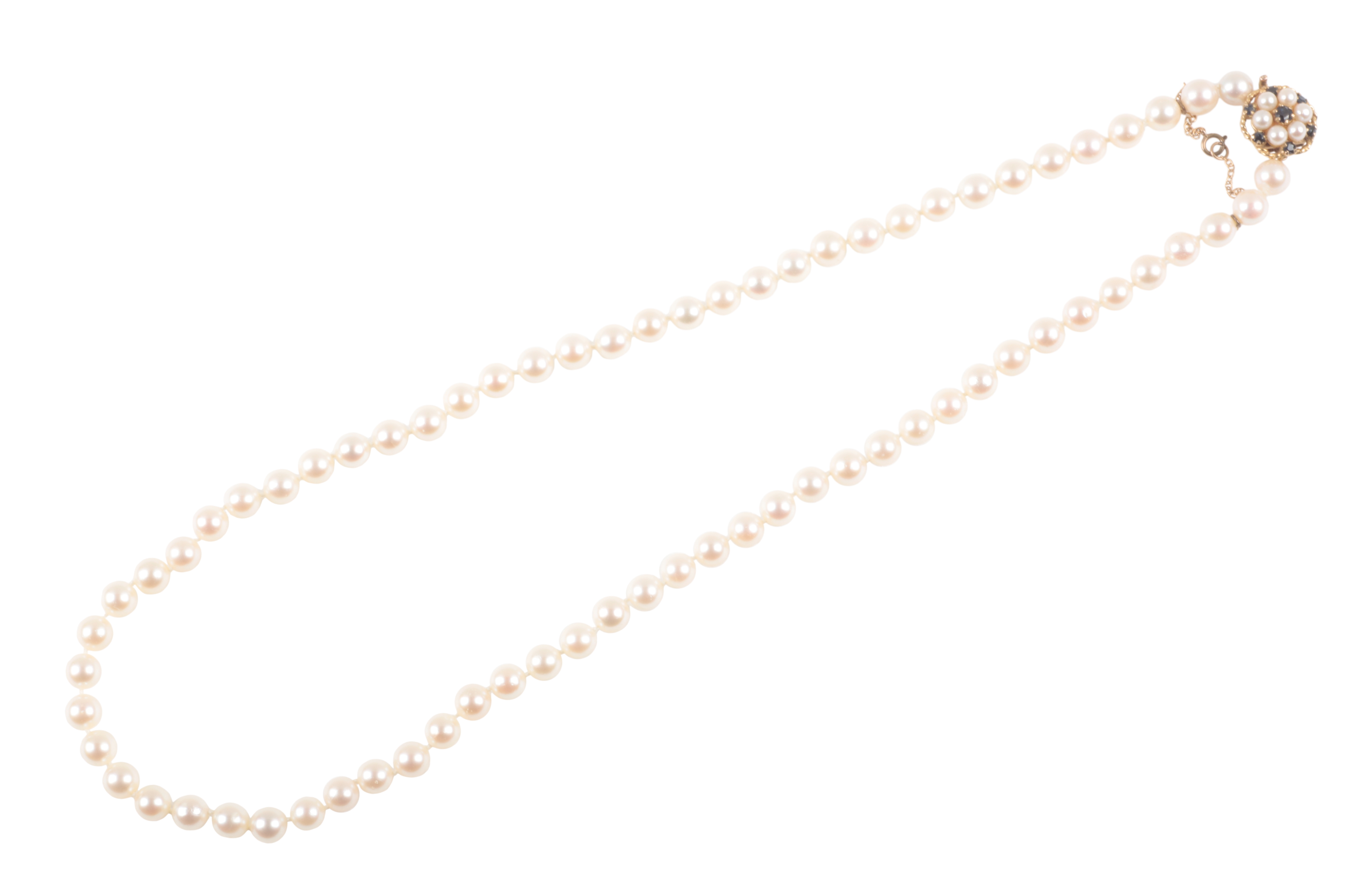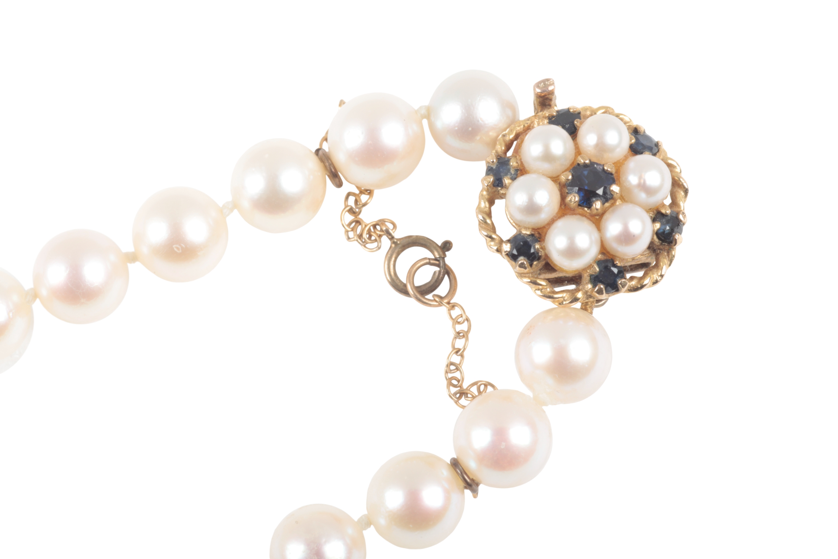 the c. 7mm knotted pearls with a sapphire and cultured pearl set clasp, stamped 9ct, c. 55cm long