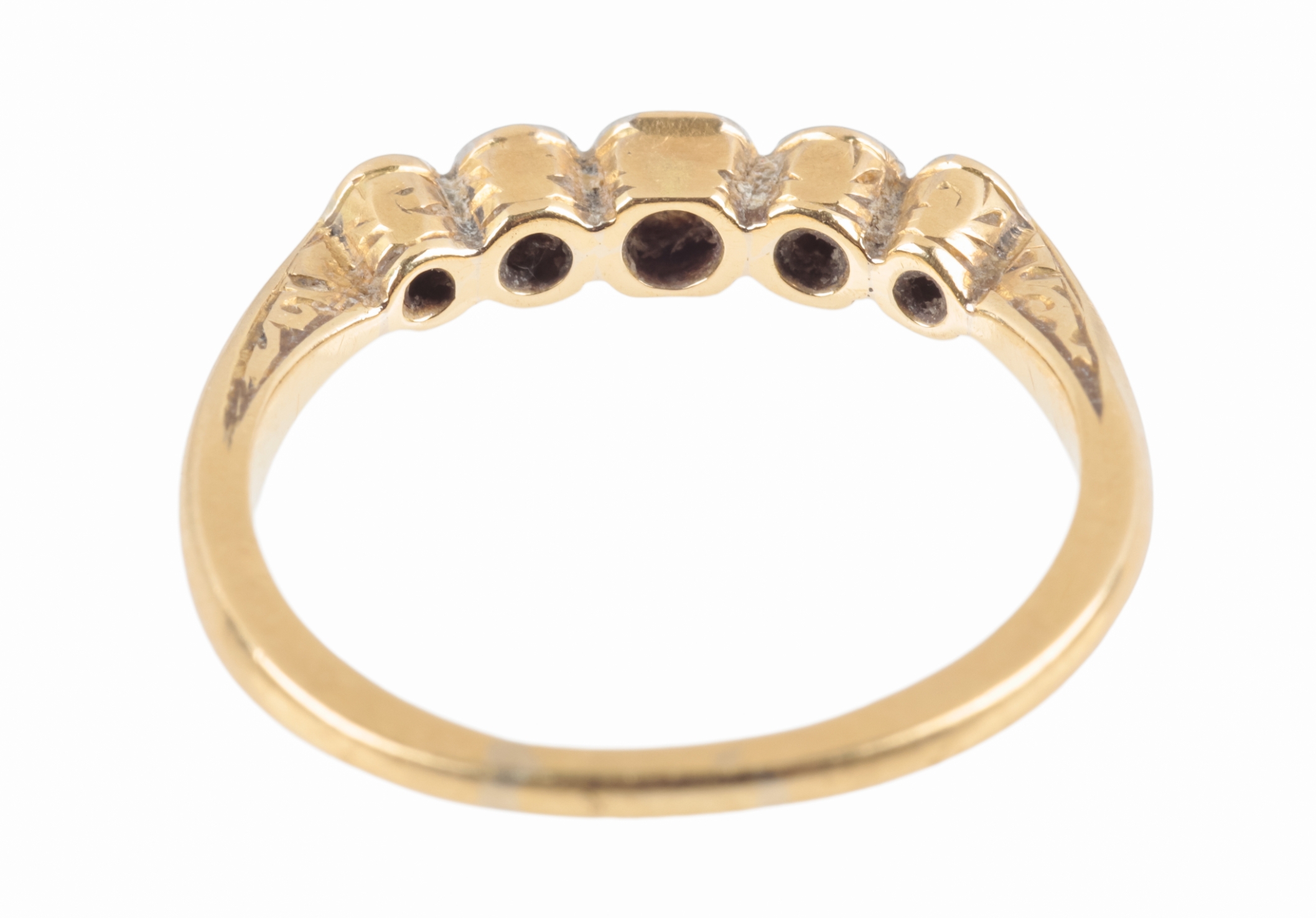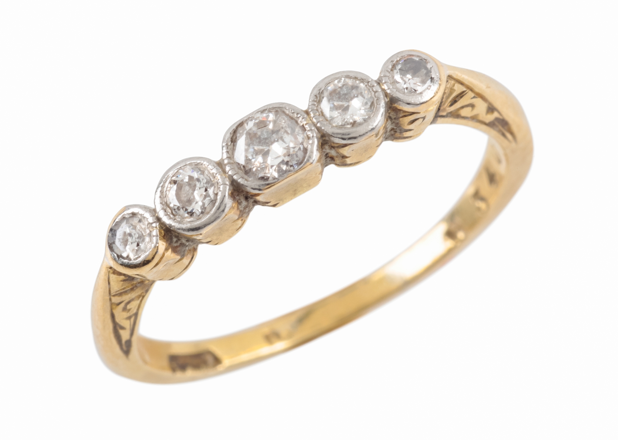 each brilliant-cut diamond collet set on a yellow gold shank, ring size M, c. 2.4 grams total weight