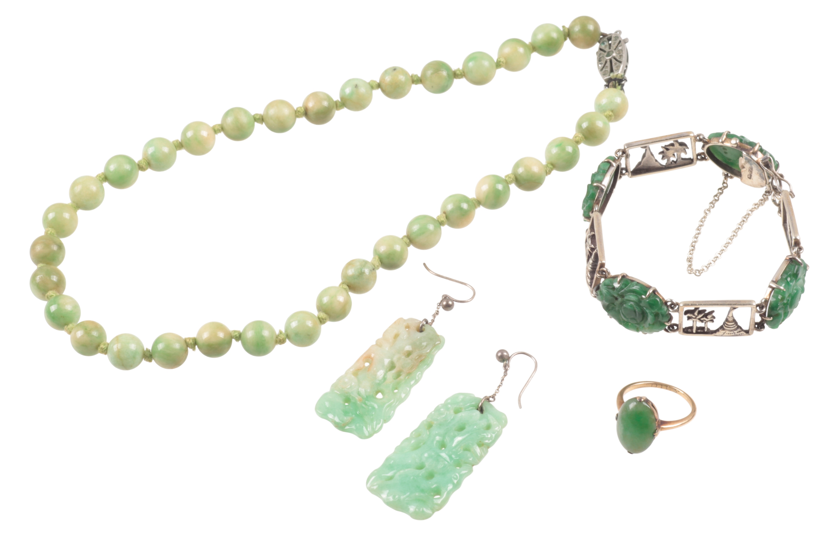 with a white metal clasp, c.37cm long; together with a pair of drop earrings with a carved and pierced panel of aventurine quartz, drop c. 52mm; a ring with steatite cabochon; and a bracelet with carved dyed jade panels, the clasp marked 9ct, with safety chain, c. 18.1 grams (4)