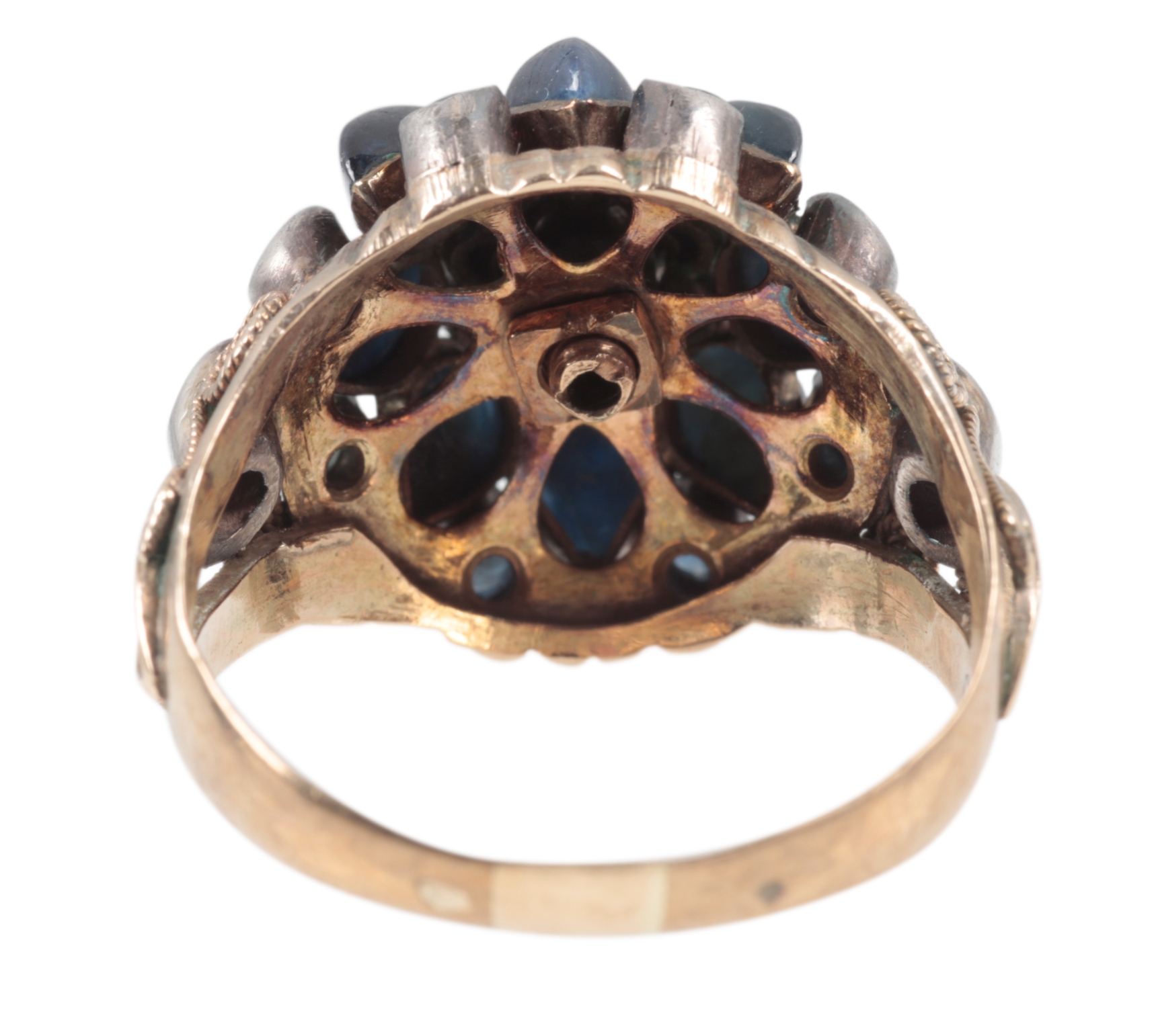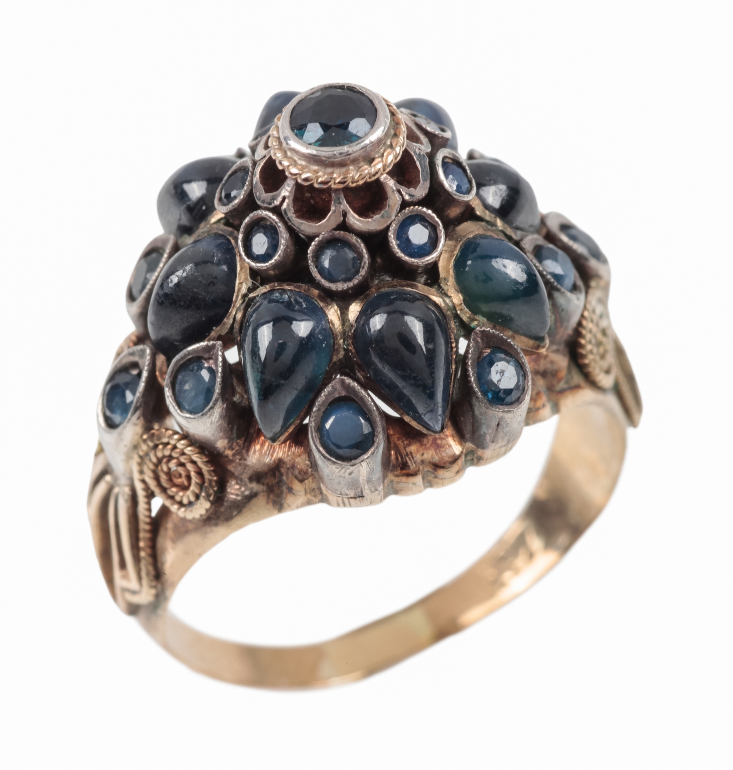 set with round mixed cut and pear shaped cabochons in yellow metal stamped 14K, ring size P 1/2, c. 6.0 grams