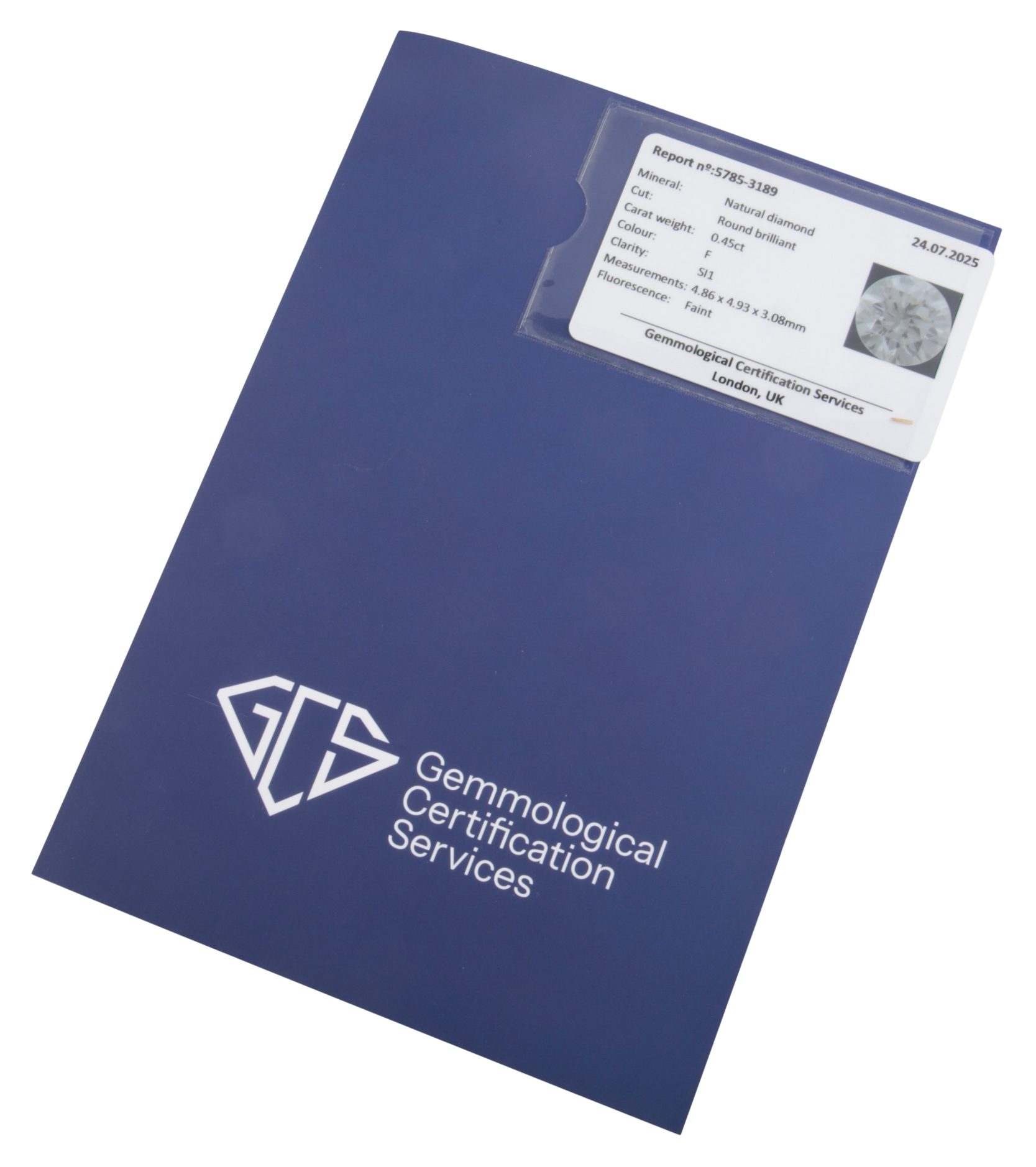together with a "Gemmological report", stating the diamond to be 0.45ct, colour F, clarity SI1