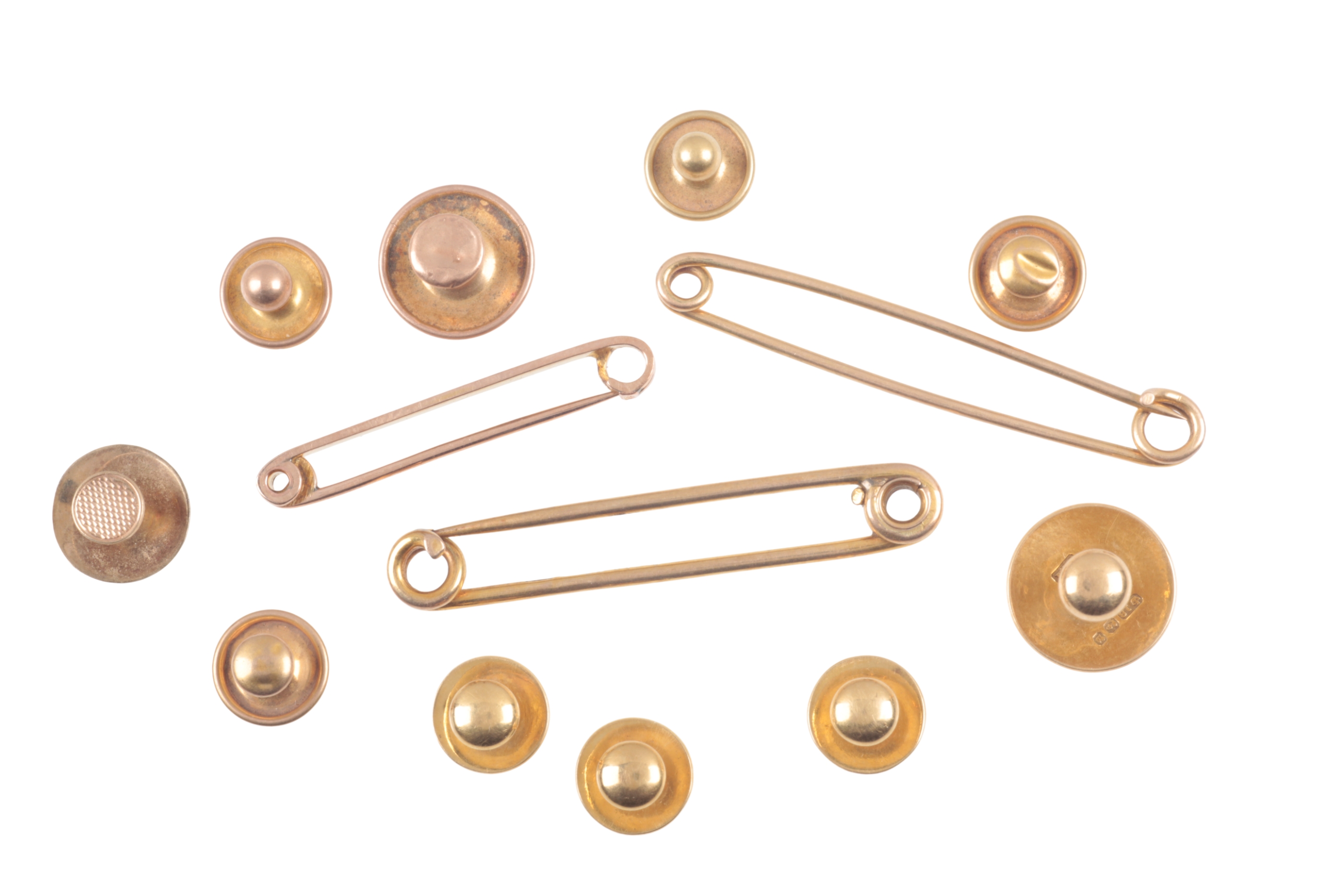 comprising a set of four 18ct gold dress studs and one other, hallmarked, two hallmarked 9ct gold dress studs, and three dress studs stamped 9ct; together a hallmarked tie pin; and two other two tie pins surface testing as 9ct, c. 18.5 grams gross weight (13)