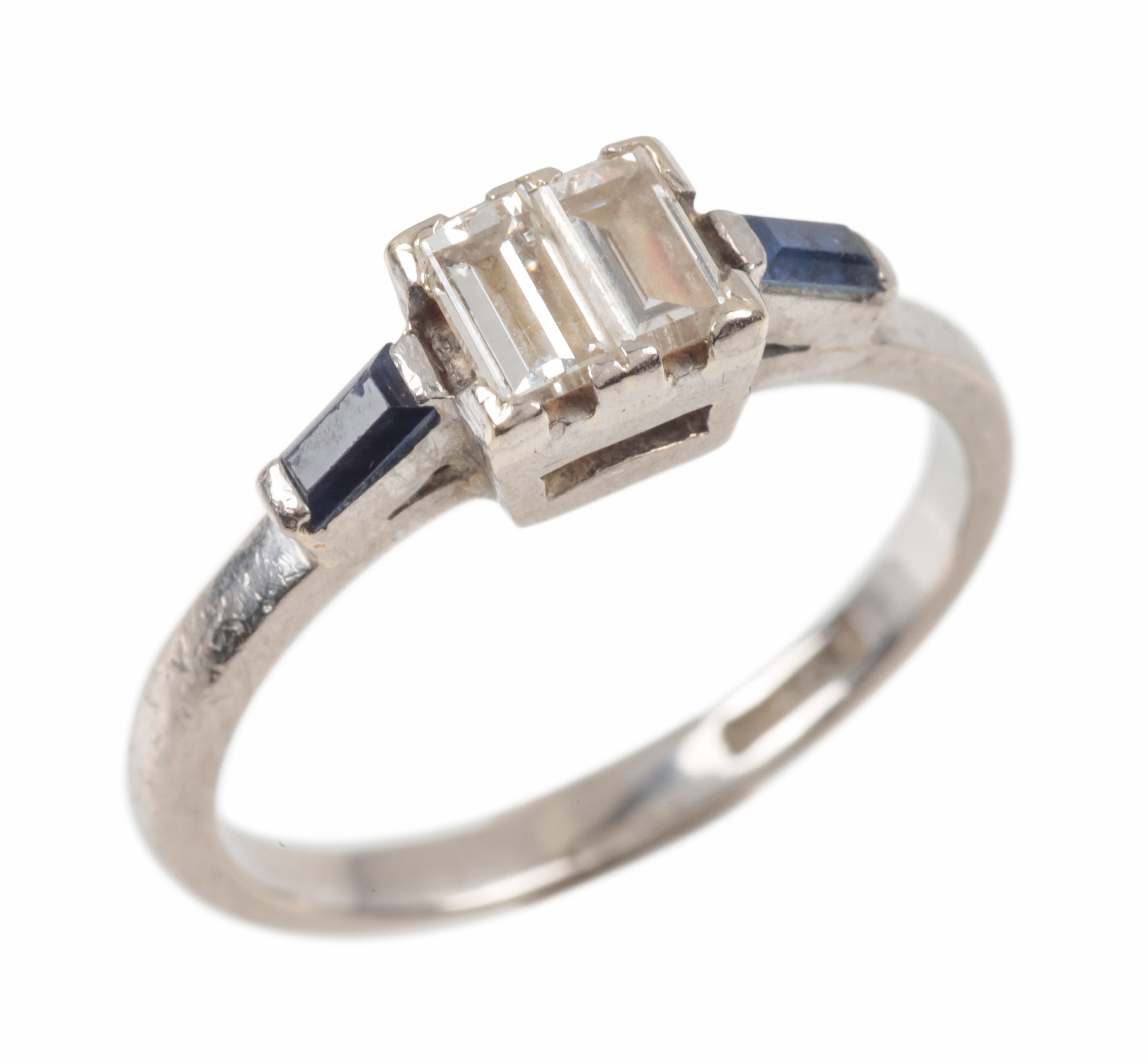 set with two baguette cut diamonds flanked by two baguette cut sapphires, the ring shank stamped 18ct, ring size L, c. 3.0 grams
