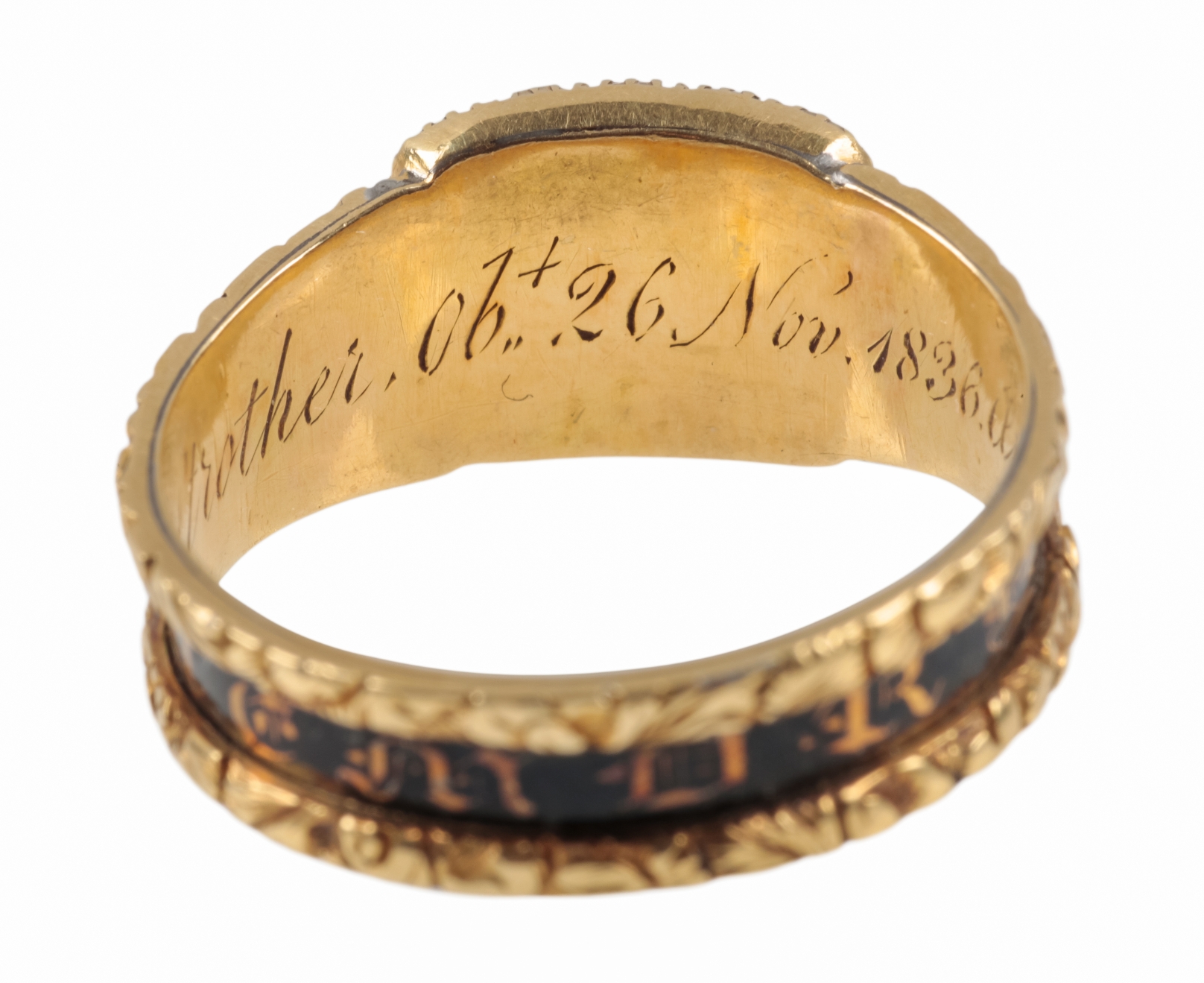 set with a hairwork panel with seed pearl surround, the black enamel band with motto between chased foliate borders, the inner shank engraved "J. Streather Obt 26th Nov 1836 at 55", hallmarked London1834, ring size R, c. 3.8 grams, (boxed)