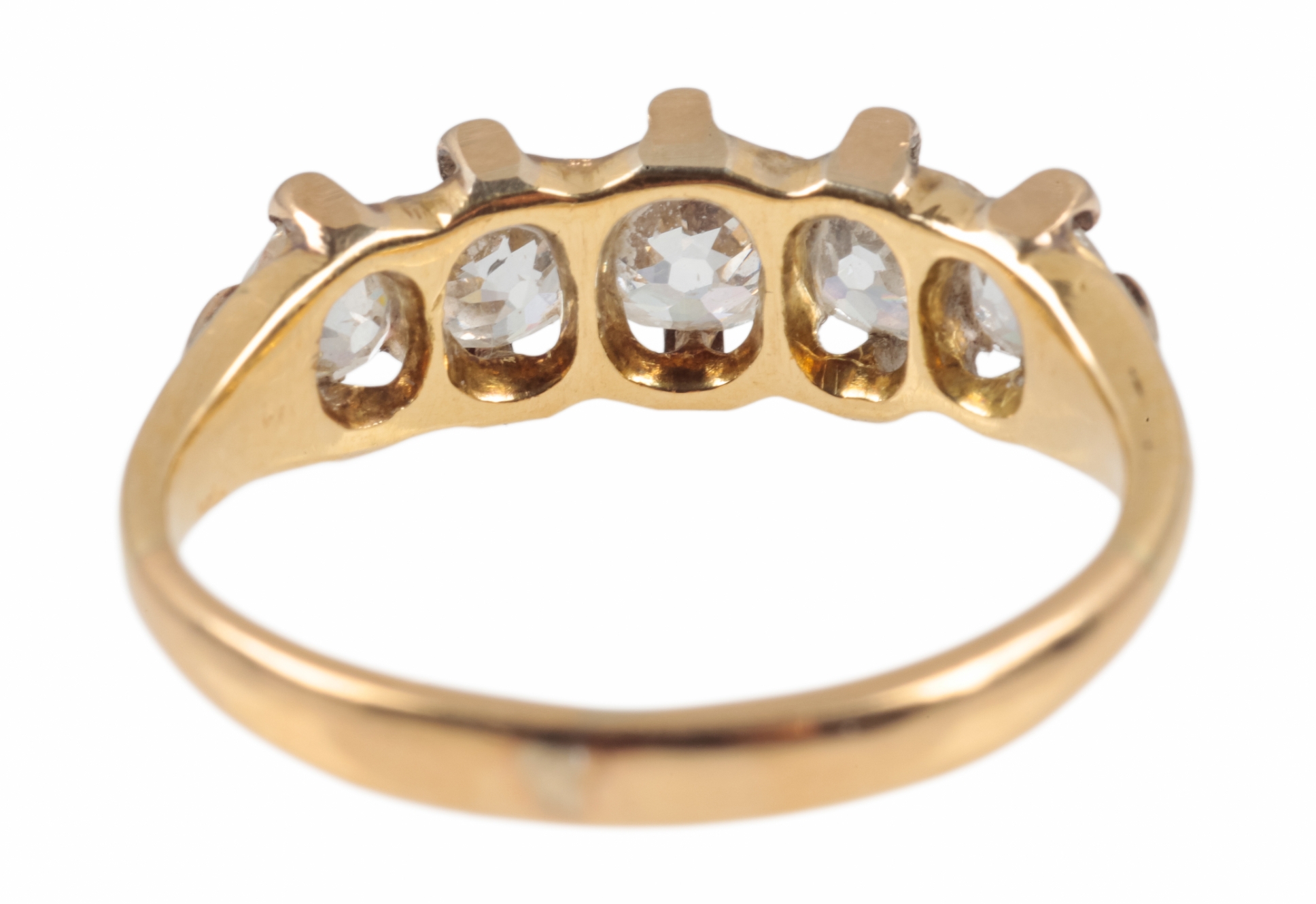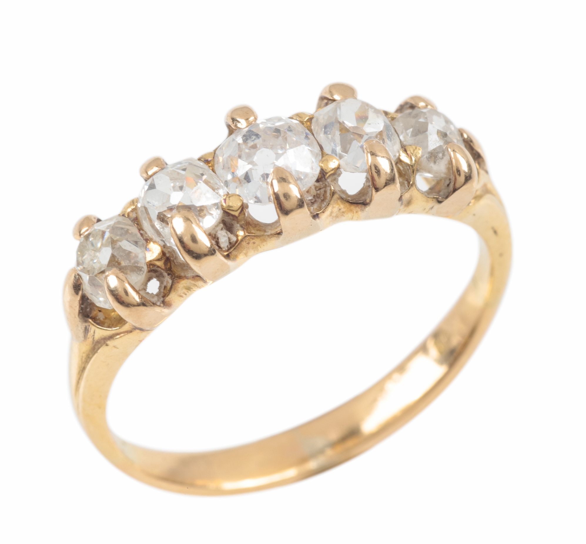 set with five old cut diamonds, c. 1.23 carats total, partial makers mark, surface testing as 18ct, ring size M, c. 3.6 grams