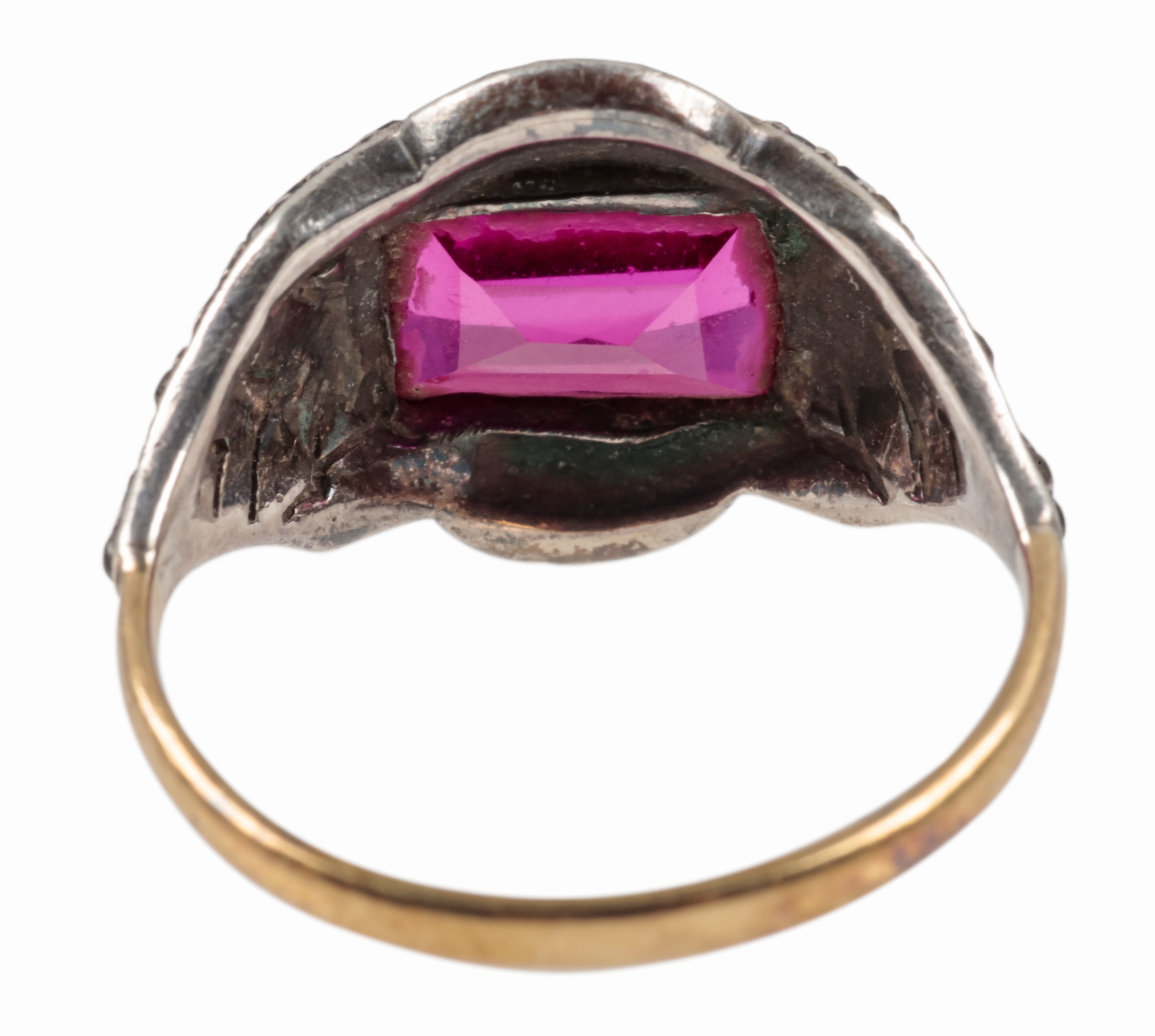 the rectangular scissor cut ruby set in white metal set with paste, the yellow shank stamped 18K, ring size N, c. 3.4 grams
