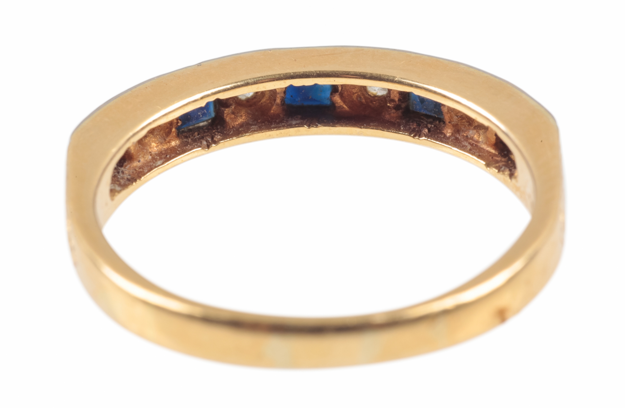 set with four single cut diamonds and five square cut sapphires in hallmarked 18ct gold, ring size P, c. 3.8 grams