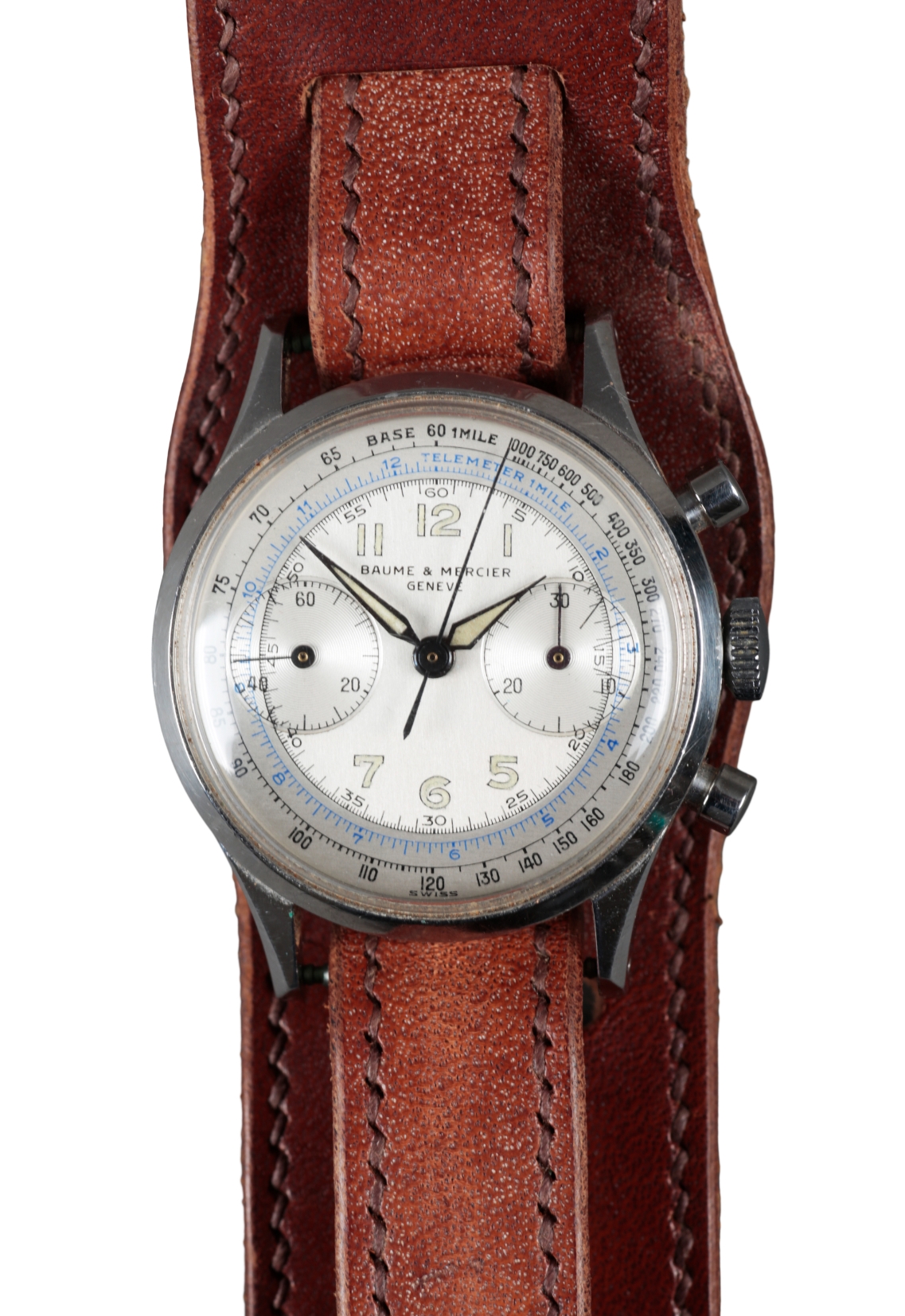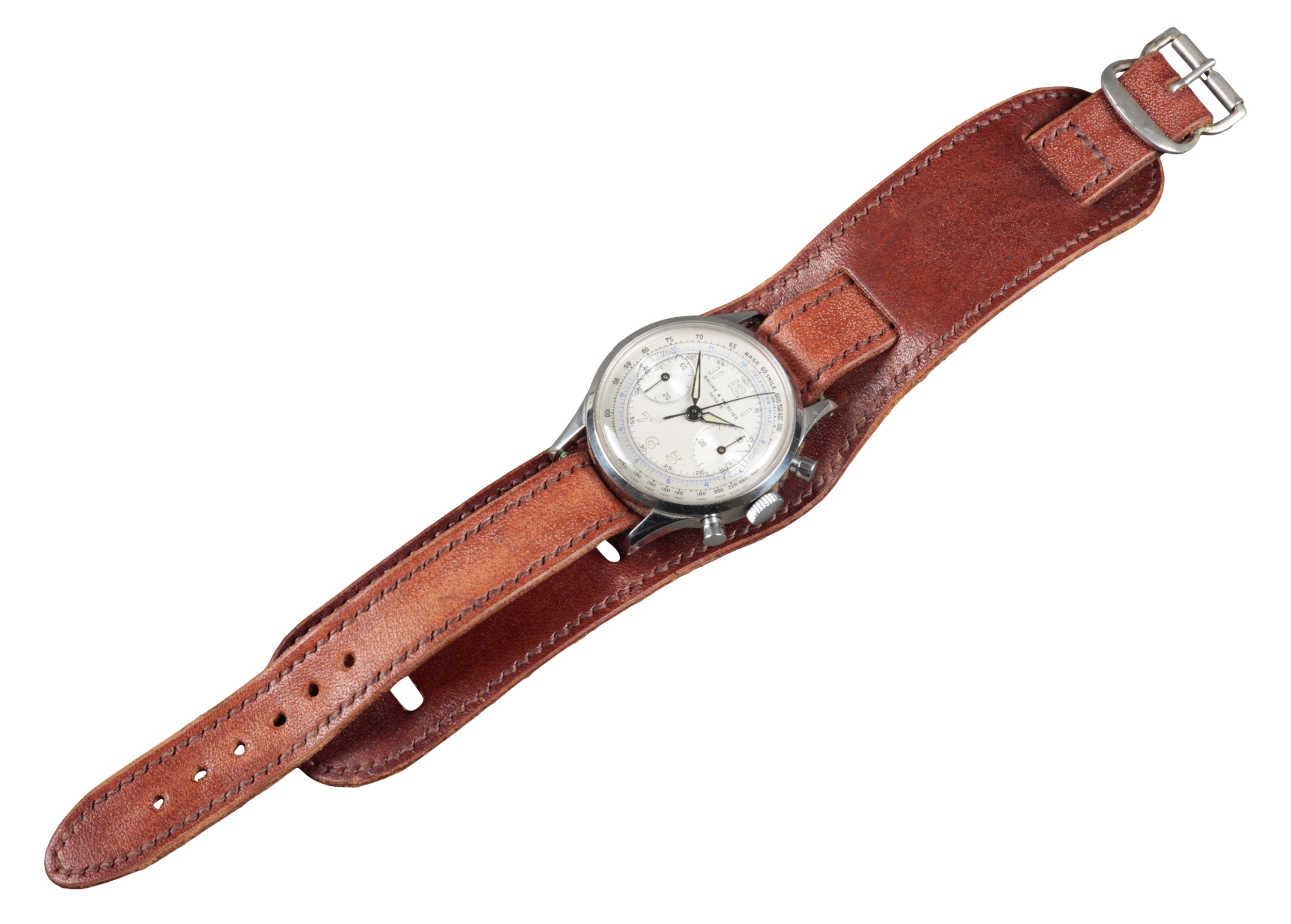 with manual wind movement, silver dial, double subsidiary dials, blue and black tachymeters, black and luminous Arabic numerals, dark blue still luminous hands, on a brown leather strap, circa 1950s, case diameter approx. 34mm
