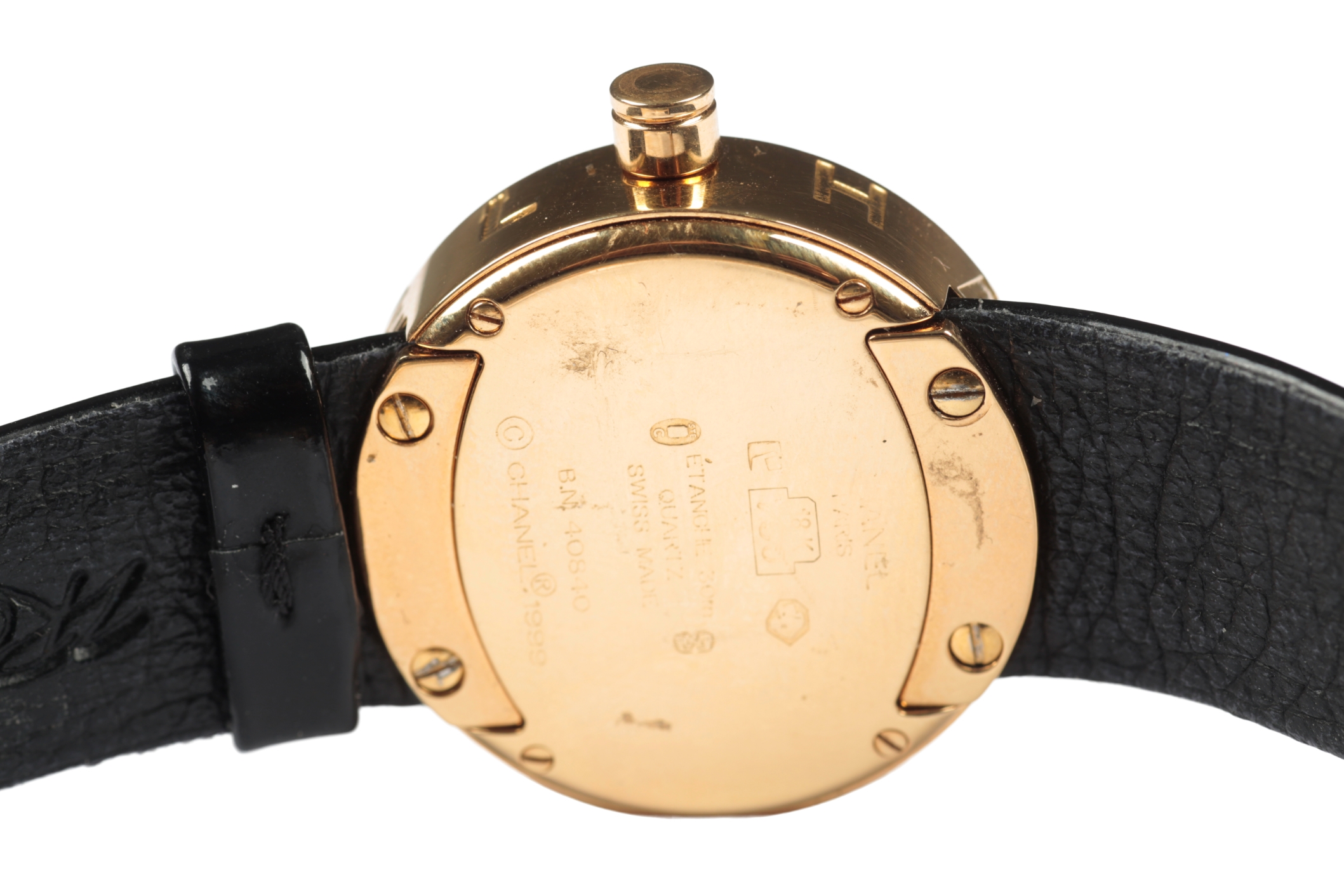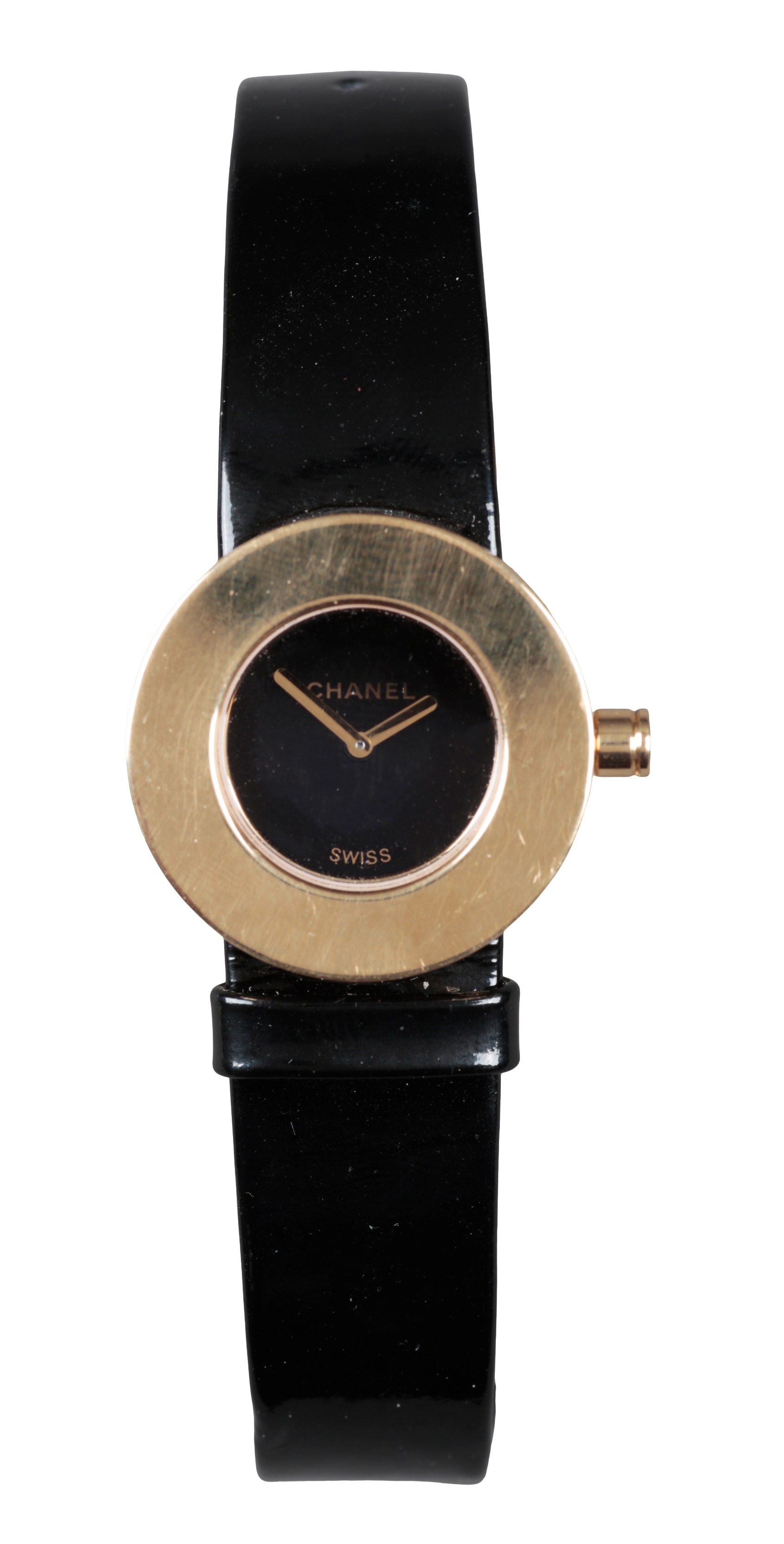 with quartz movement, black dial, gold hands, on a black leather strap, with deployment clasp, case diameter approx. 30mm