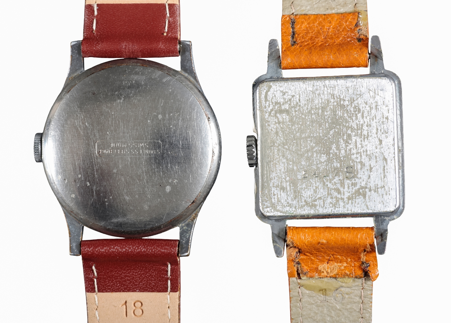 with manual wind movement, silver dial, subsidiary seconds dial, gold Arabic numerals, gold hands, on a brown leather strap, circa 1940s, case diameter approx. 25mm; together with a Medana stainless steel wrist watch with manual wind movement, silver dial, black Arabic numerals, dark blue steel hands, on a brown leather strap (2)