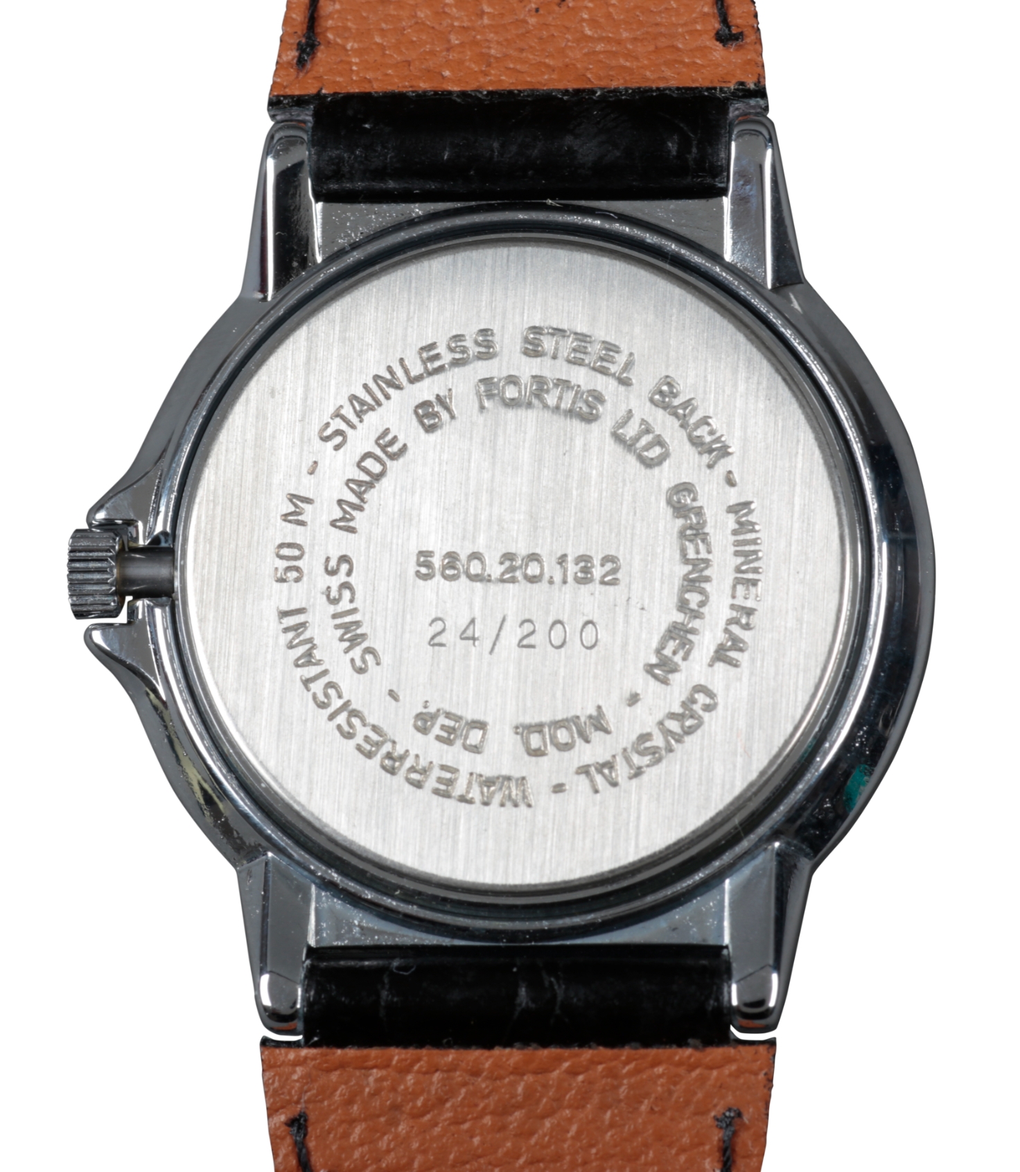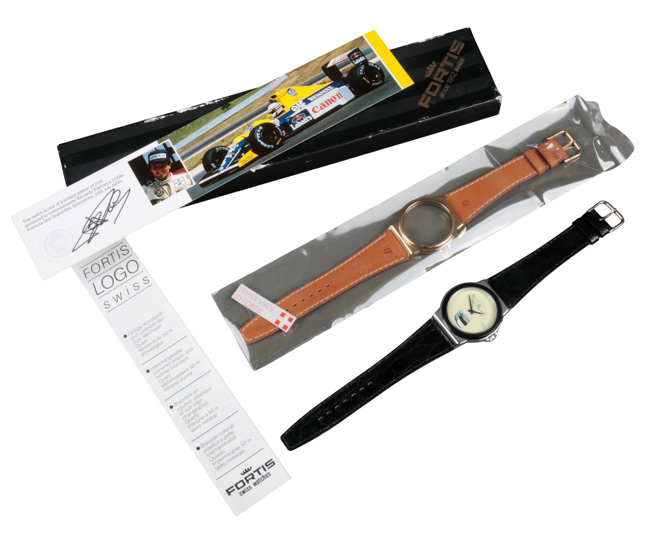 dated Silverstone 15th July 1990, with quartz movement, in its original Fortis watch box with guarantee, spare gold plated case and leather strap, case diameter approx. 34mm, number 24/200