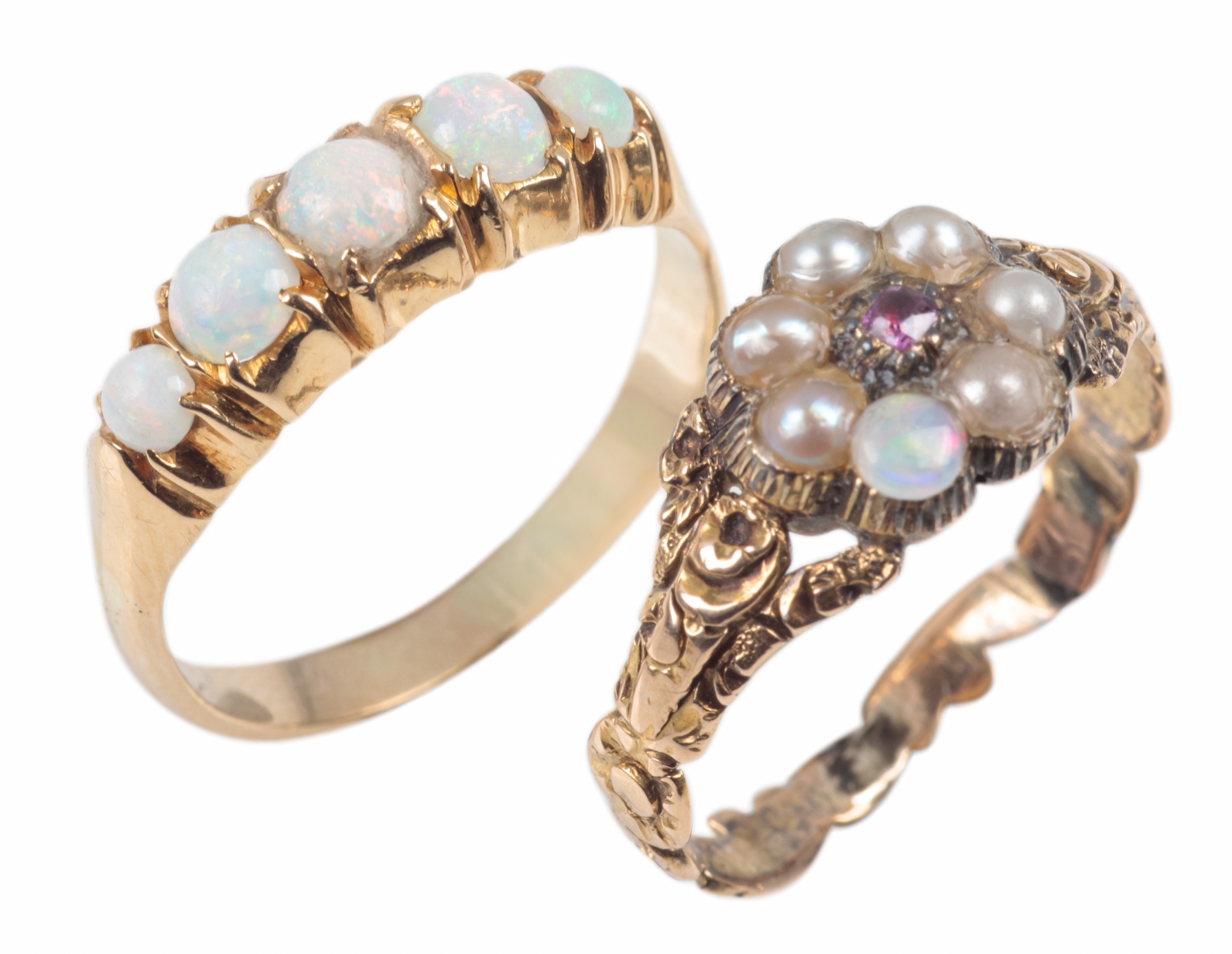 set with five round graduated cabochons, in unmarked yellow metal, surface testing as 9ct, ring size O 1/2; together with a flowerhead ring with simulated pearls around amethyst coloured paste, unmarked, testing as 9ct, ring size N 1/2, c.4.7 grams gross (2)
