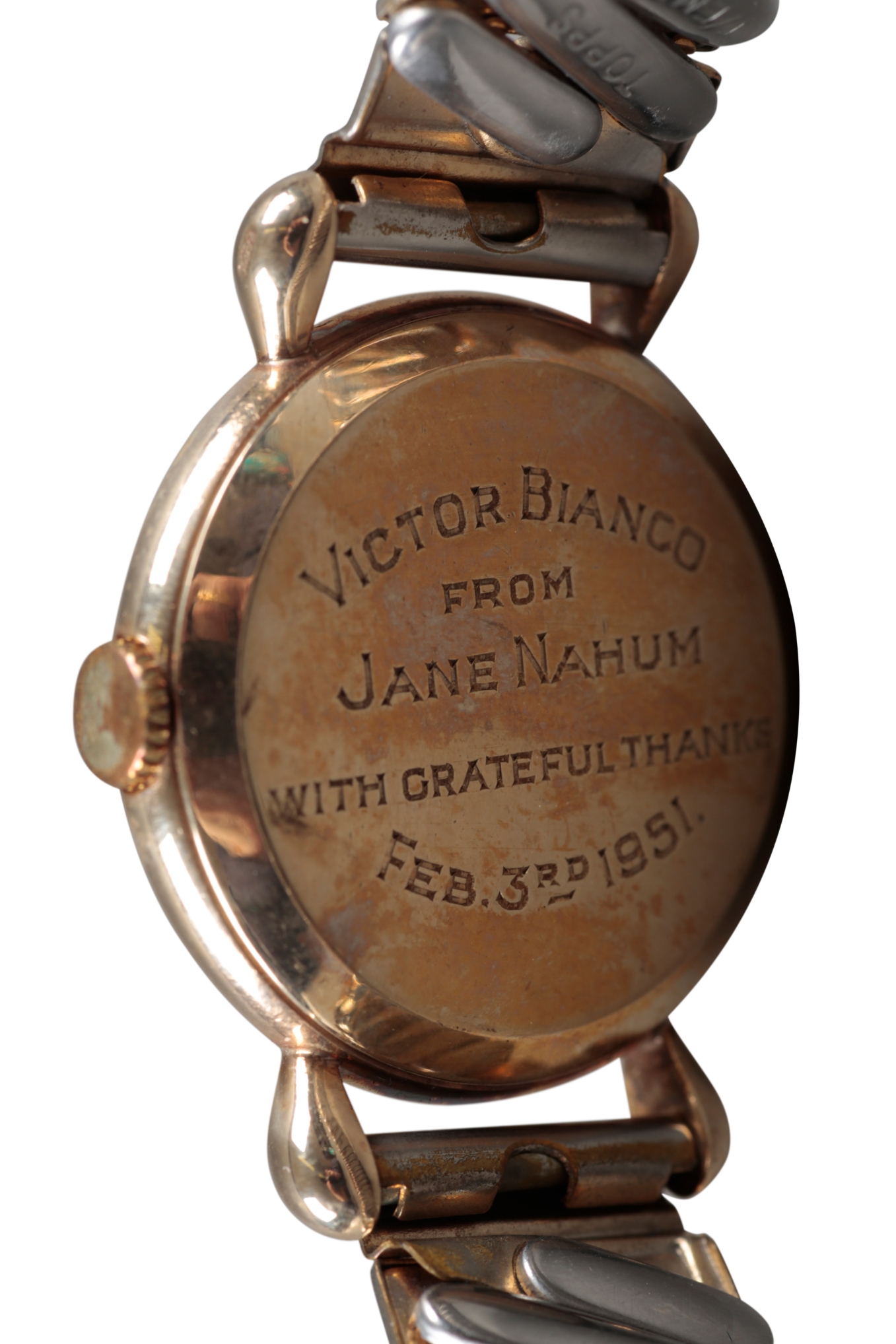 with manual wind movement, white dial, gold Arabic numerals, gold hands, dark blue steel seconds hand, with teardrop lugs, caseback engraved with inscription 'Victor Binbianco from J. Nahum with grateful thanks February 3rd, 1951', case diameter approx. 28mm