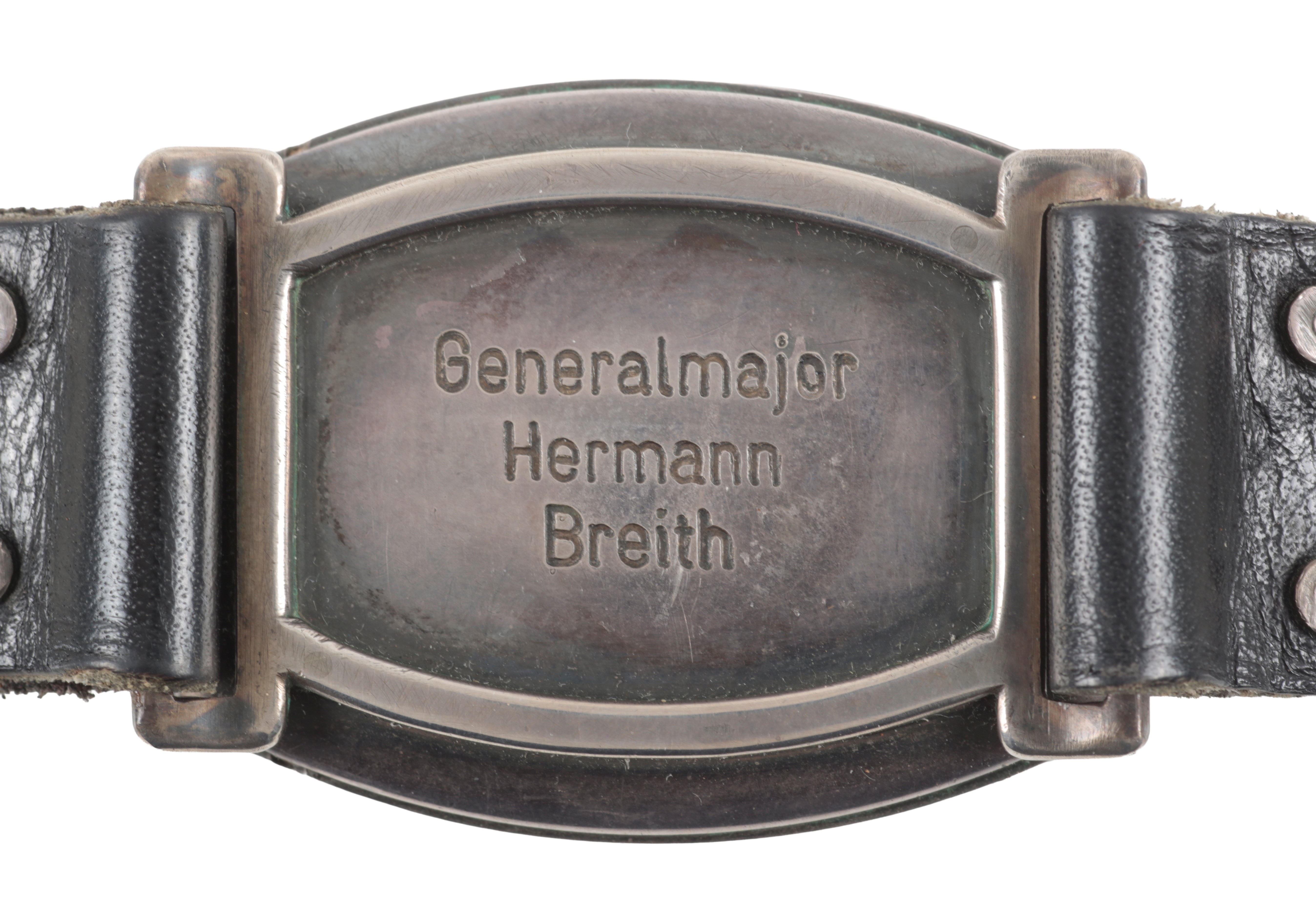 The watch was specially made for General Hermann Breith, Commander of a Tank Brigade and recipient of a Knights Cross. It is illustrated in the book "Military Timepieces" by Konrad Knirim, page 177.