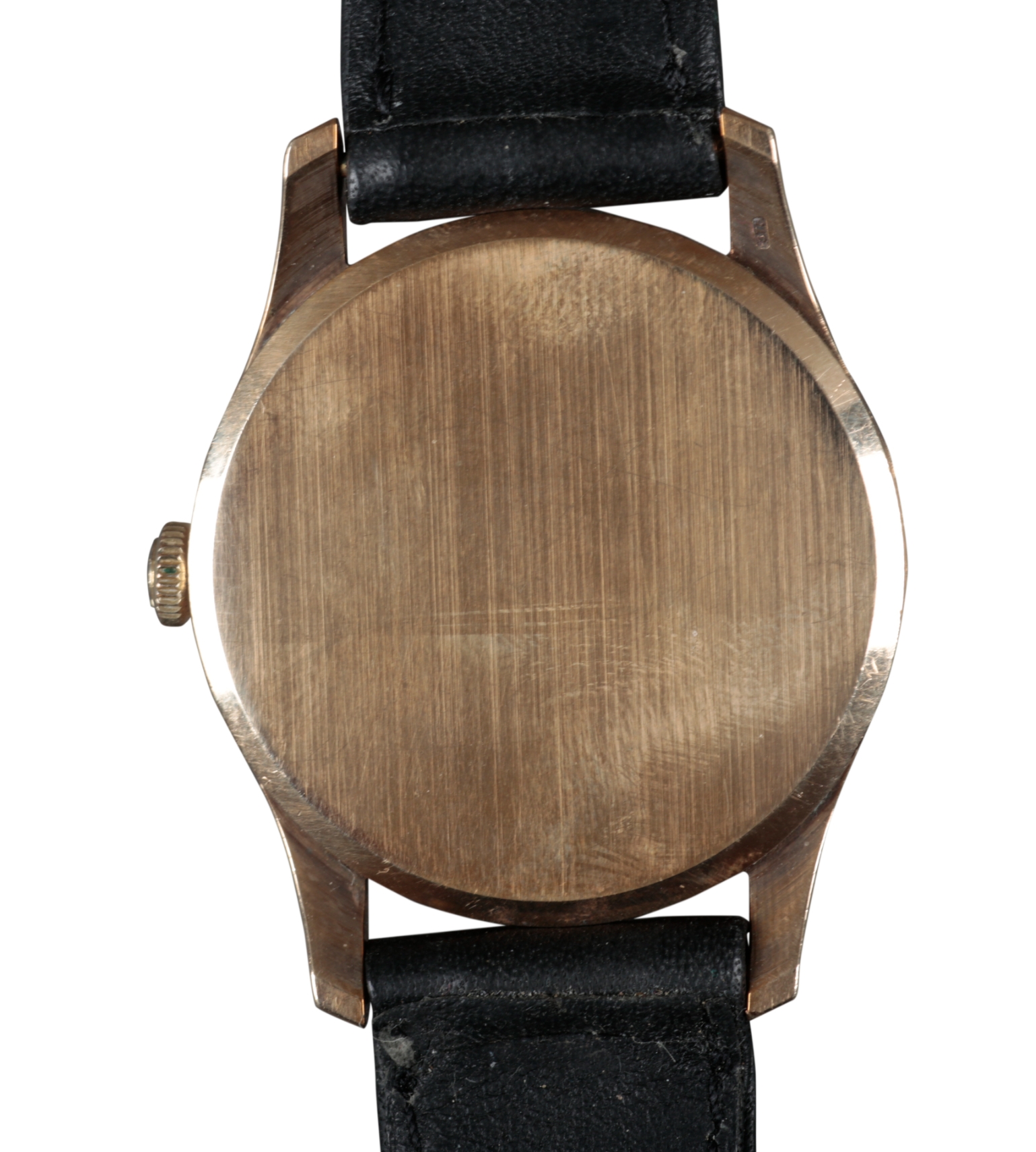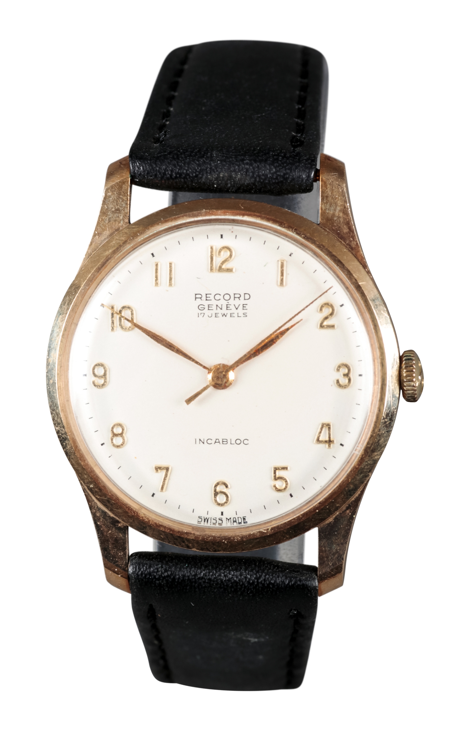 with manual wind movement, silver dial, gold Arabic numerals, gold hands, on a black leather strap, circa 1960s, case diameter approx. 32mm