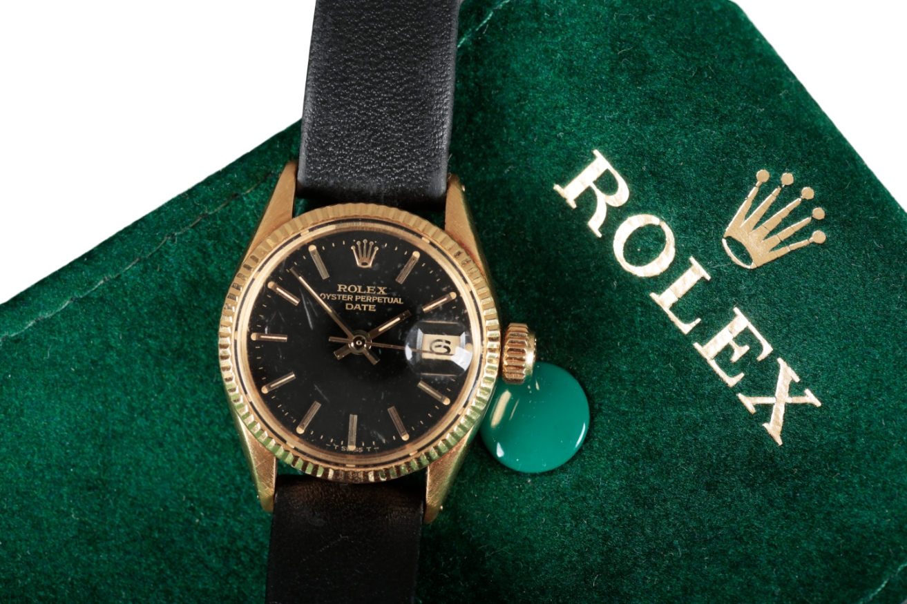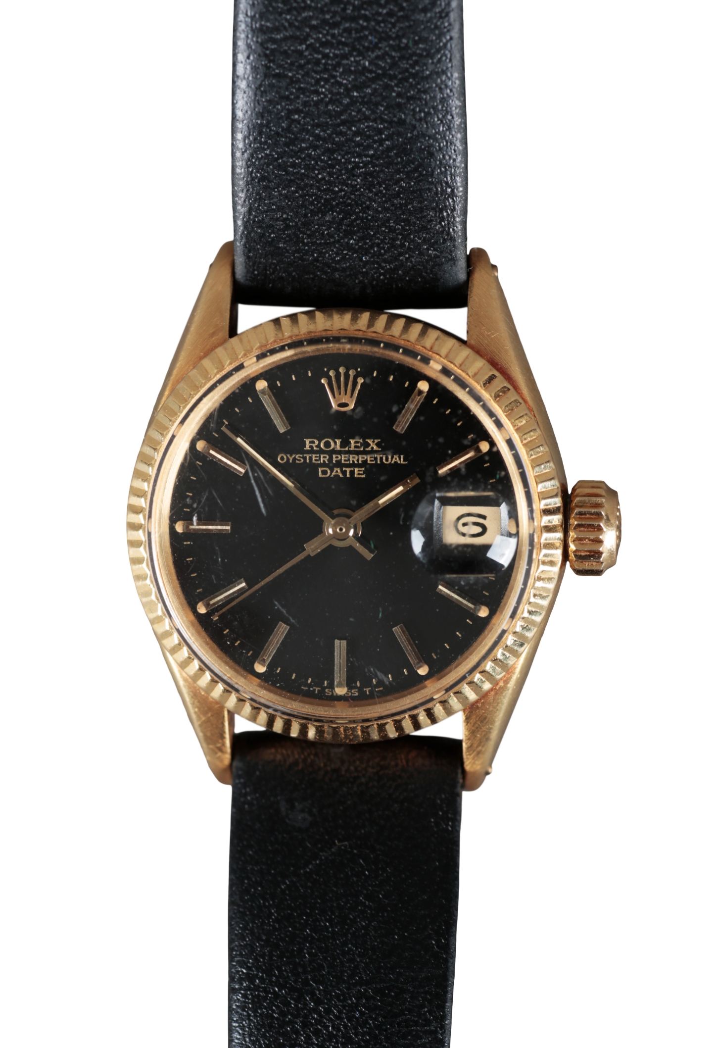 with automatic movement, black dial, gold baton numerals, gold hands, date aperture, gold Rolex logo crown, on a black leather strap, with a Rolex suede watch service pouch, case diameter approx. 25mm