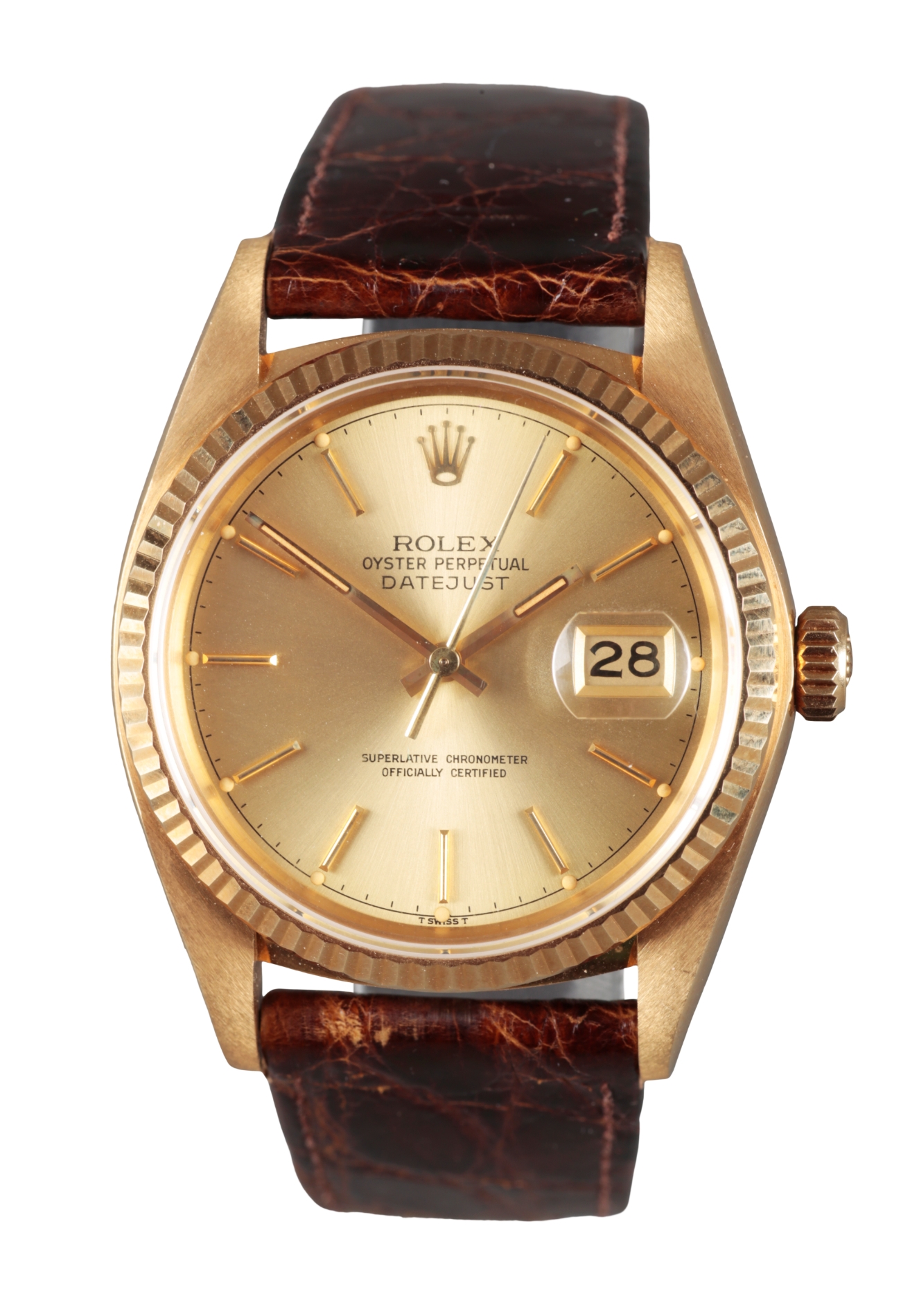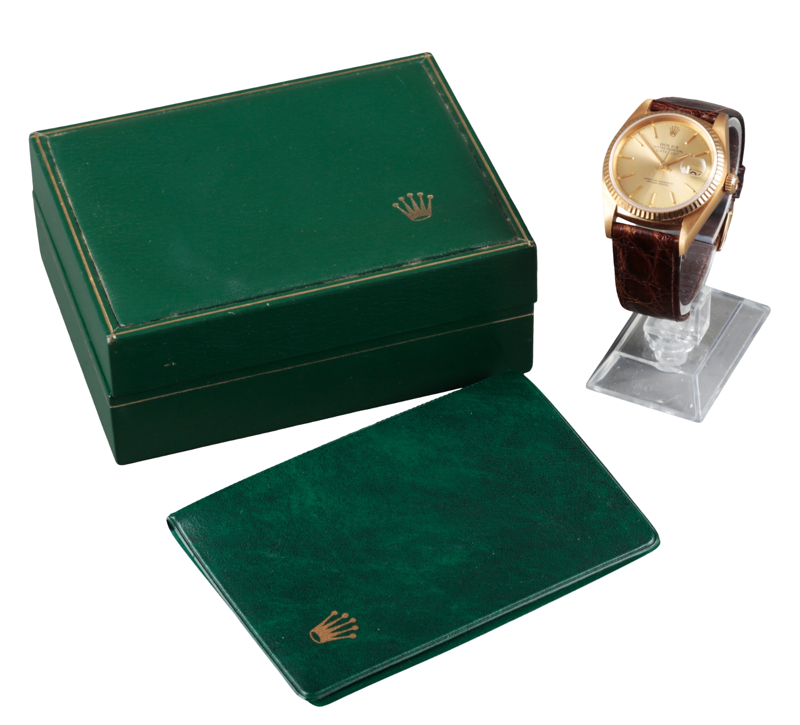 with automatic movement, gold dial, gold baton numerals, gold hands, date aperture, Rolex logo crown, on a brown Rolex leather strap, with Rolex 18ct gold buckle, in its original Rolex watch box, with Guarantee Certificate, circa 1980s, case diameter approx. 38mm