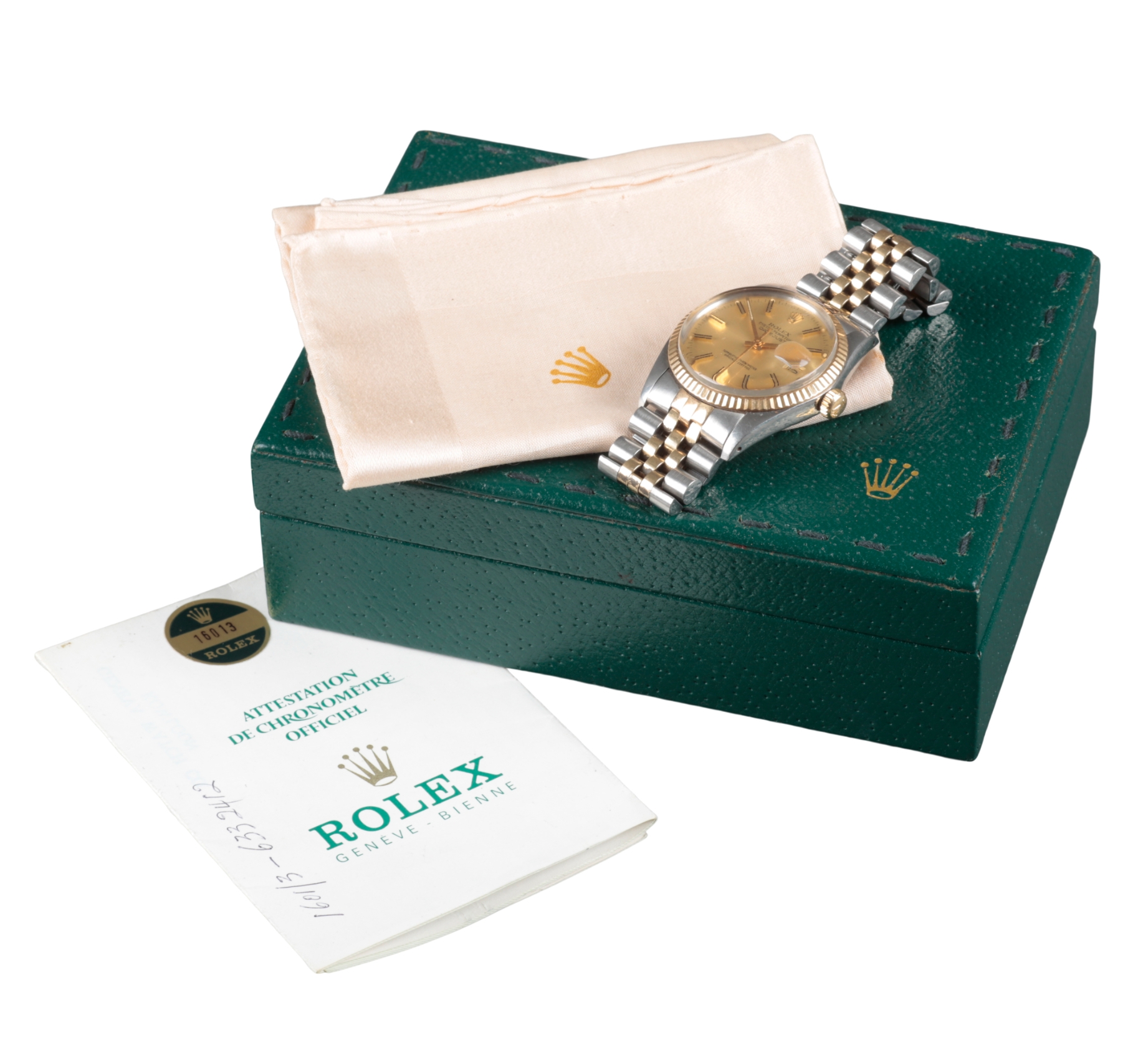 with automatic movement, gold dial, gold baton numerals, gold hands, date aperture, Rolex logo gold crown, in its original Rolex watch box with Rolex silk handkerchief and Guarantee, chronometer Certificate, case diameter approx. 34mm