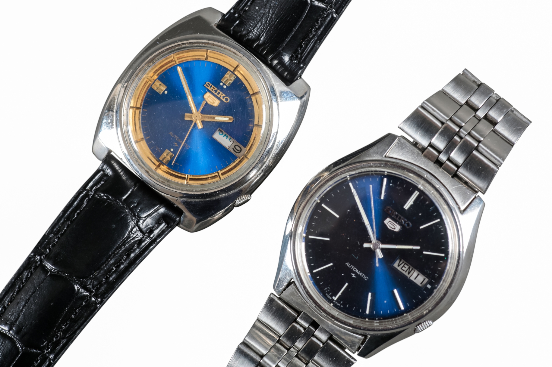 with automatic movement, blue and gold two-tone dial, date aperture, gold baton numerals, gold luminous hands, on a black leather strap, circa 1970s, case diameter approx. 34mm; together with another Seiko 5 stainless steel wristwatch with automatic movement (2)