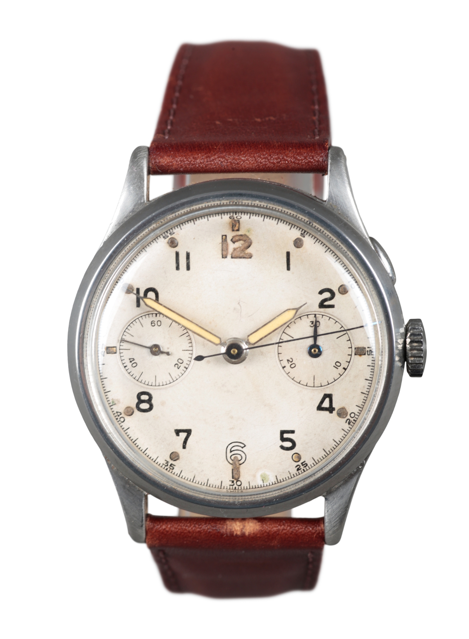 with manual wind movement, cream dial, double subsidiary dials, black and luminous Arabic numerals, dark blue and luminous steel hands, on a brown leather strap, circa 1950s, case diameter approx. 34mm
