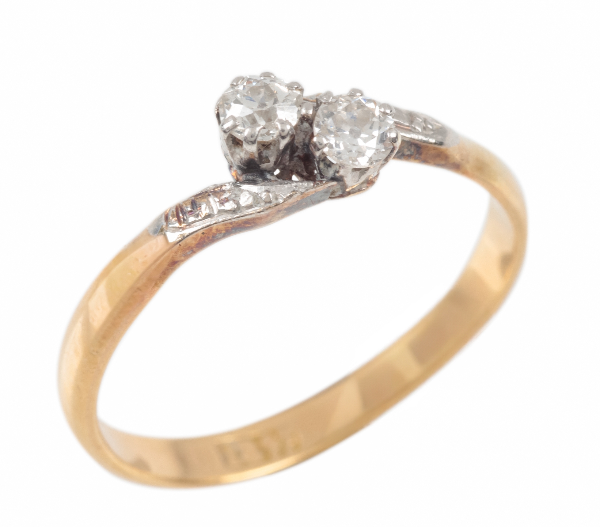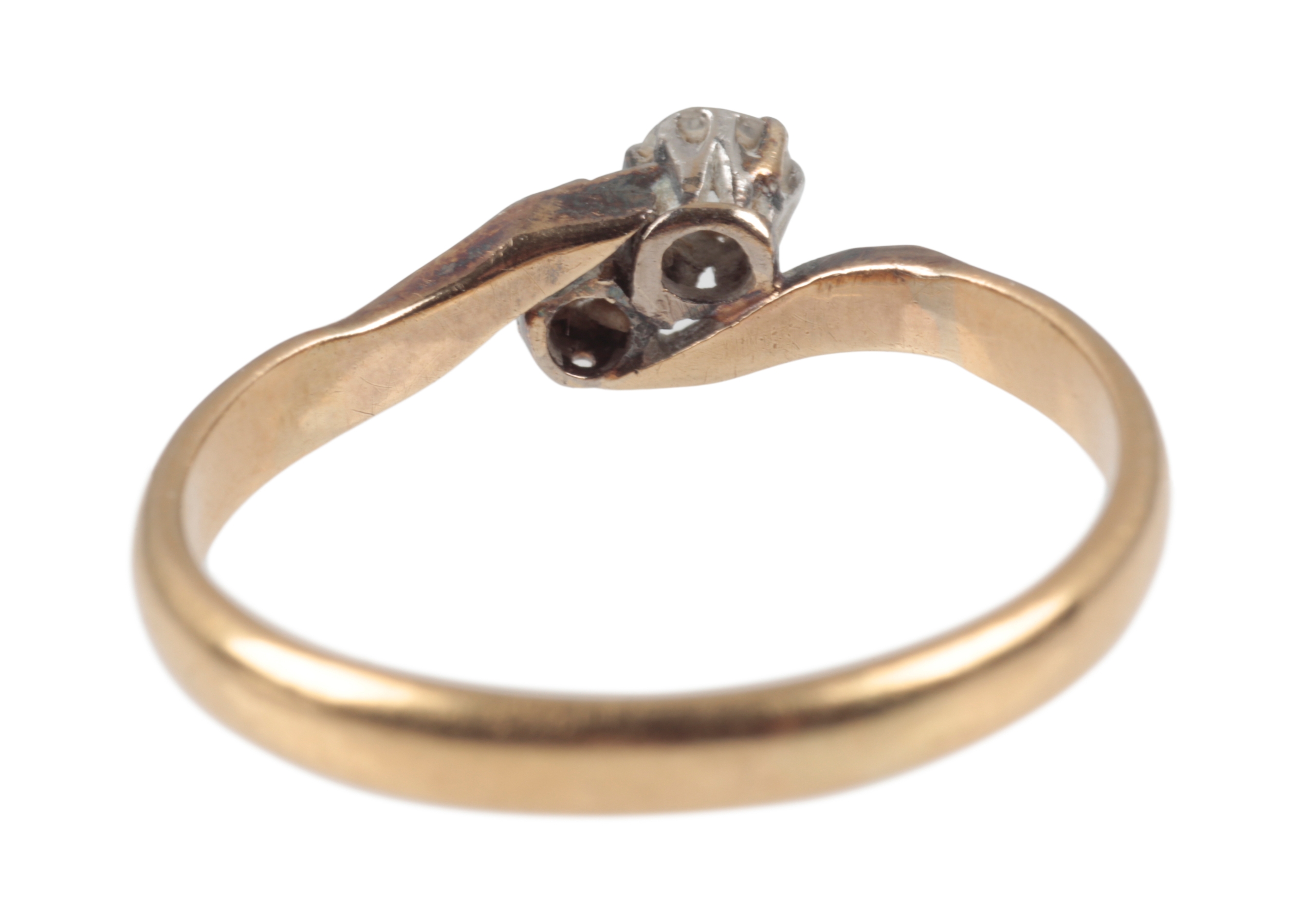 set with an old cut diamond and a round brilliant cut diamond, the yellow metal shank stamped 18ct, ring size O 1/2, c. 2.4 grams