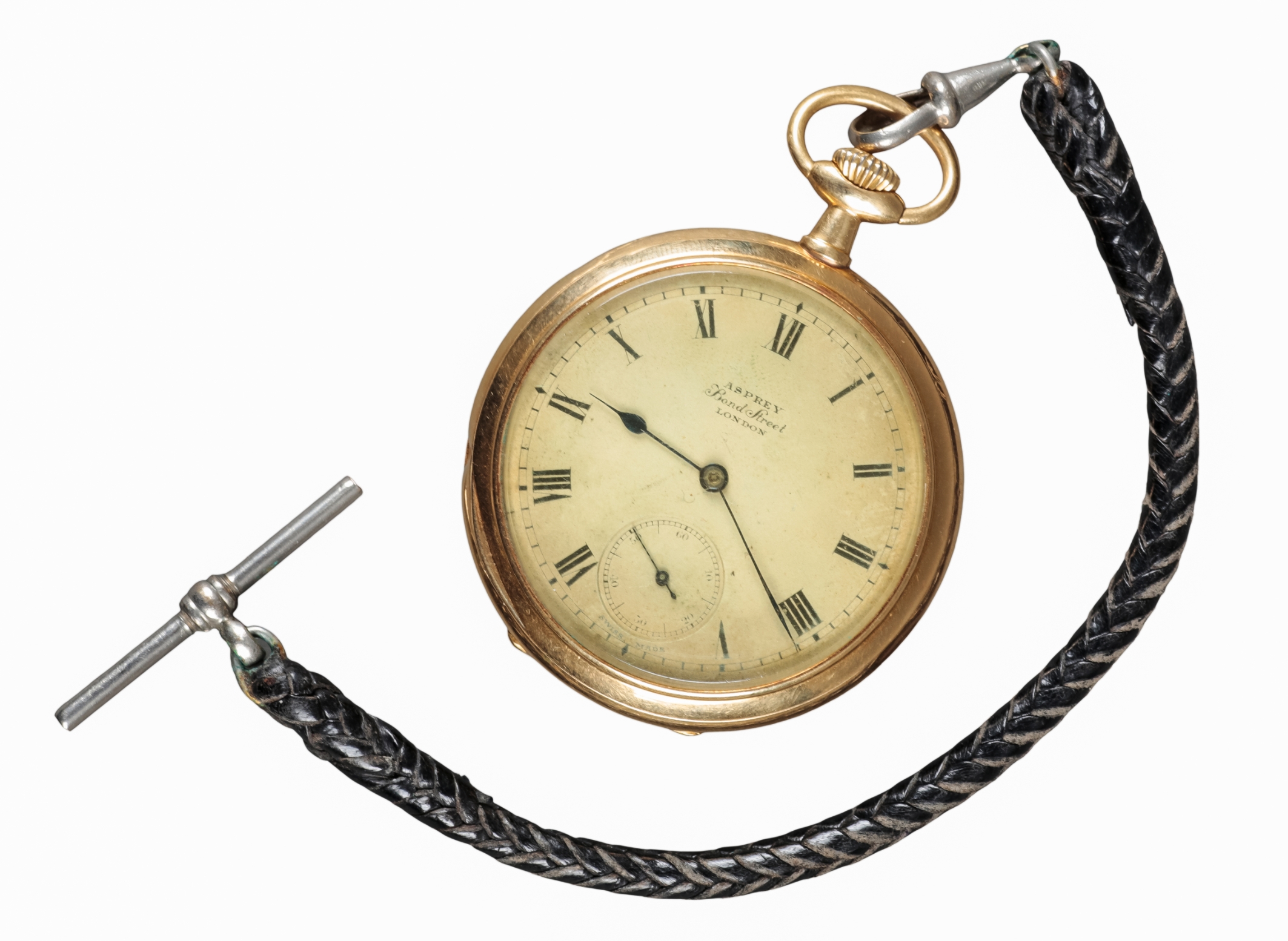 with keyless wind movement, gold dial, black Roman numerals, subsidiary seconds dial, dark blue steel hands, calendar dial to the caseback with dark blue steel hand, with a leather watch chain, case diameter approx. 50mm, c. 70.38 grams gross weight
