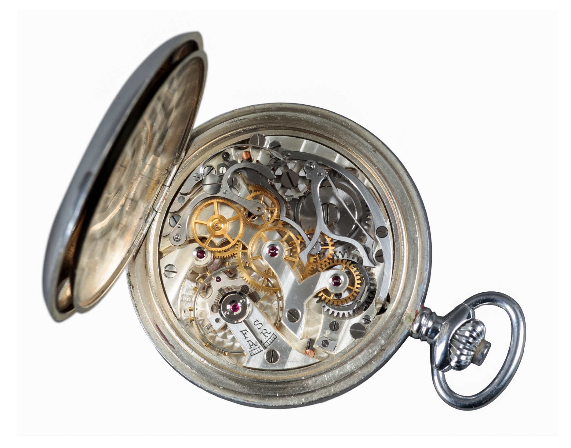 MINERVA: A NICKEL-PLATED OPEN FACE CHRONOGRAPH POCKET WATCH